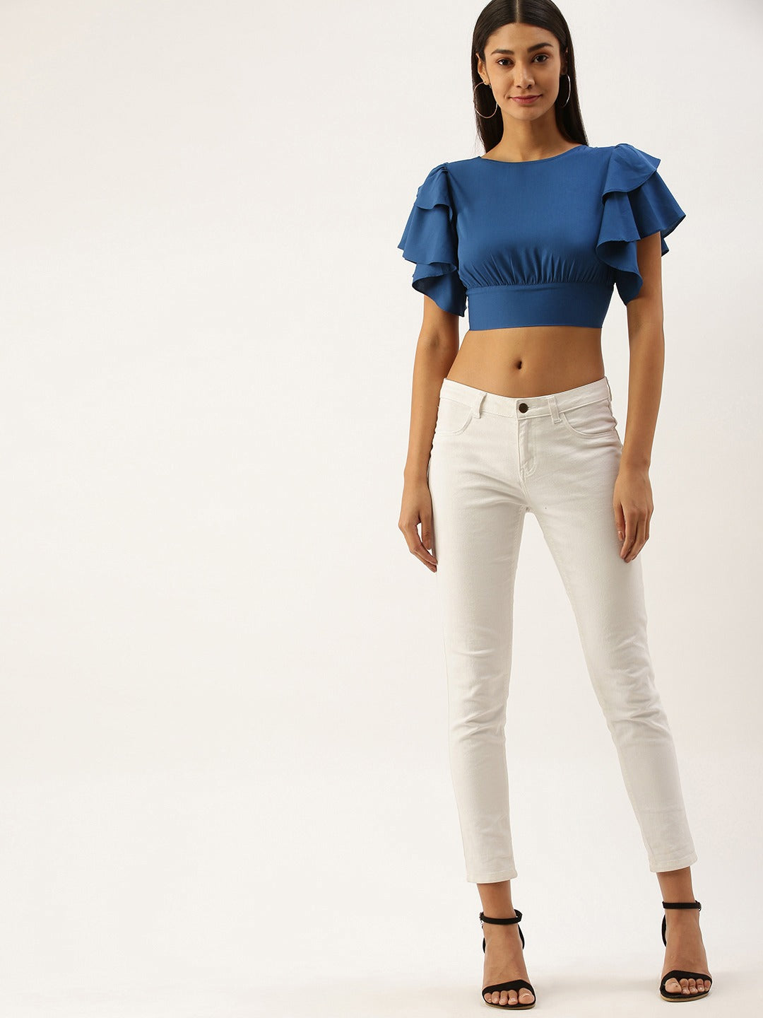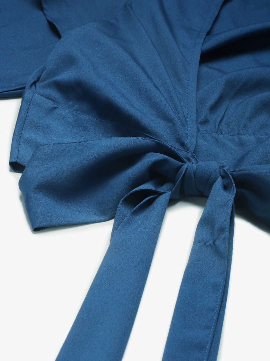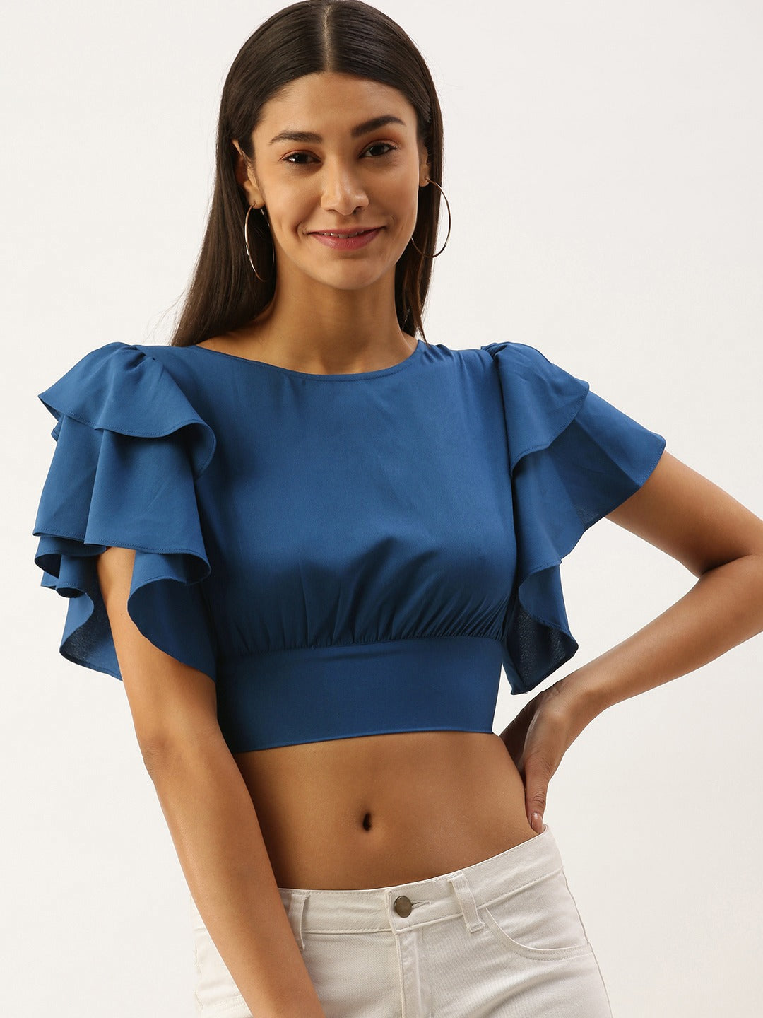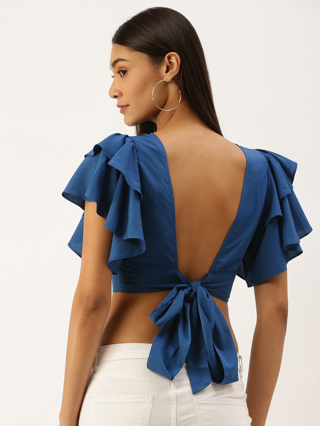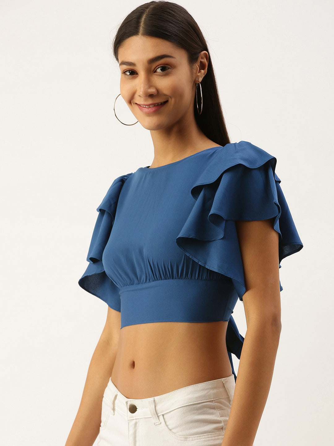 Berrylush Solid Blue Open-Back Blouson Crop Top adds a spice of fashion to your apperiance. Even with a matte texture, this outfit has an unmatched grace. The silhouette of the blouson pattern adds up to an extra glamour. Short flutter sleeves give an exclusive chic flavor to your look. Blue as a dark shade helps you to retain your curves into shape but try not to stick with over decorative items rather add some minimalist pastel-colored tapered mid-length skirts and ankle boots. Since too much experiment with this shade might bring out a fashion disaster. Buy this smart matte blue blouson top from Berrylush and reflect a neat look wherever you go.