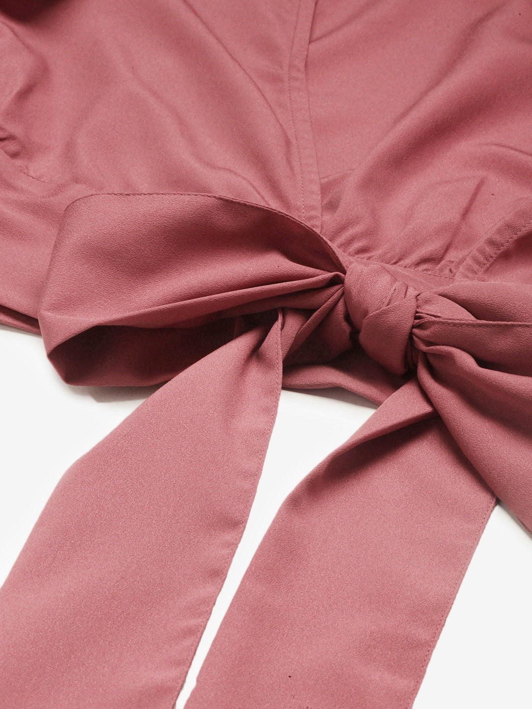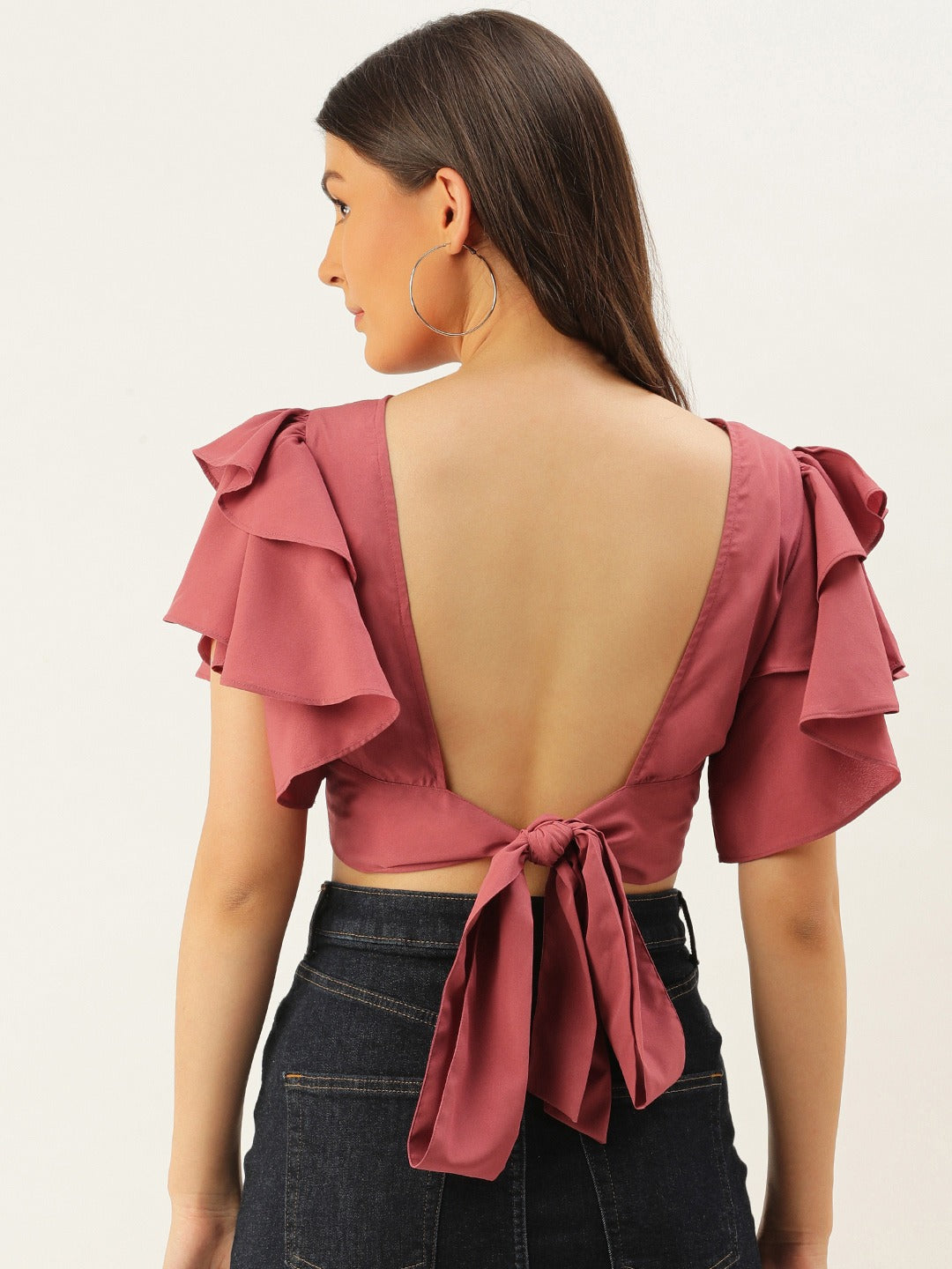 Fabulous handcrafted design with beautiful finishing put all together in this Berrylush Solid Light Pink Open-Back Blouson Crop Top. Ladies this time set an exemplary fashion statement with its exclusive open-back design and long knotted detailing. Blouson-patterned silhouette exaggerates a woman's hidden glamour all the time. The tapered semi-ruffled bodice is an amazing add-on that escalates the elegance of this attire to another level. Charming short flutter sleeves provide a perfect flared aura to your arms leaving an expensive mark. Needless to emphasize its color, as pink is the ultimate grace for femineity thus simply pair it up with dark-colored tapered jeans and pastel-shaded ballerinas. Buy the ultimate feminine piece from Berrylush and keep blushing.