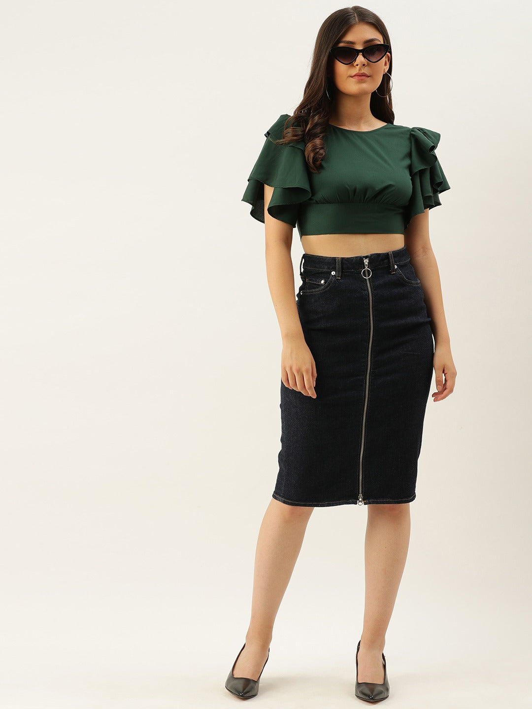 Make a style statement with this stunning blouson top by Berrylush. Features flutter sleeves that complement the fashionable appearance of this top. Designed with a cropped length and fitted silhouette to accentuate your midriff for a flattering appeal. Crafted with woven crepe material to help keep you at ease all day long. Its open back design creates a stylish and trendy look, perfect for your party wear collection. Quick drying properties of this top helps manage moisture to keep you dry and cool during warm weather conditions. Get a chic look by styling this top with our best choice high-rise denim jeans and block heel pumps.