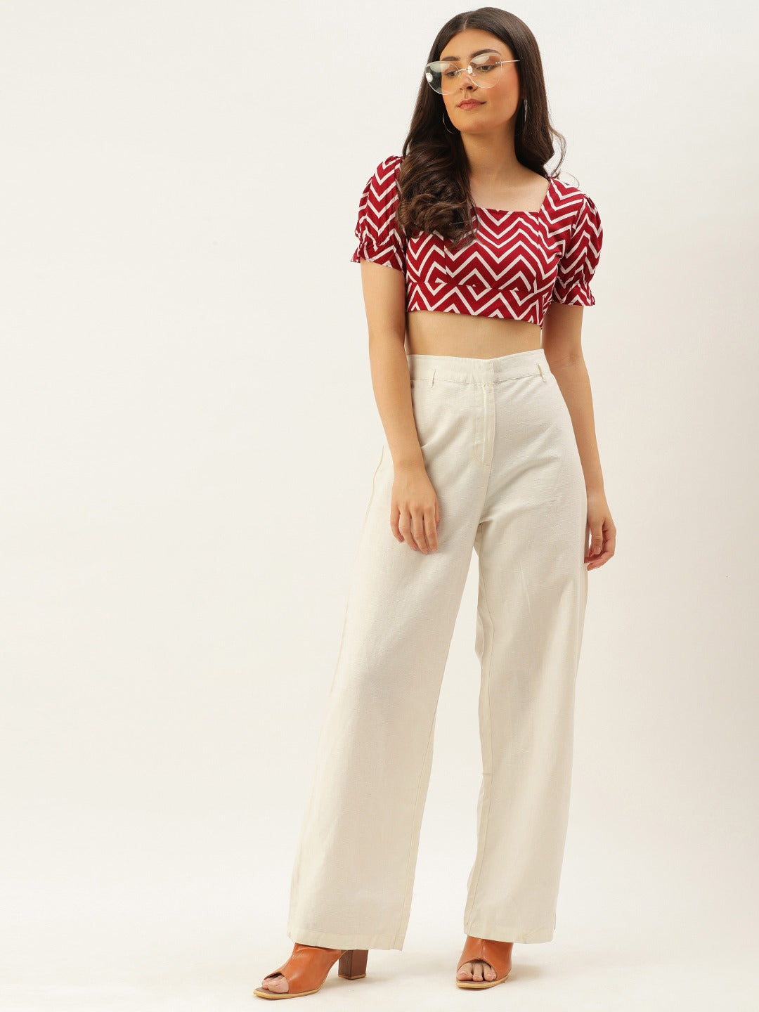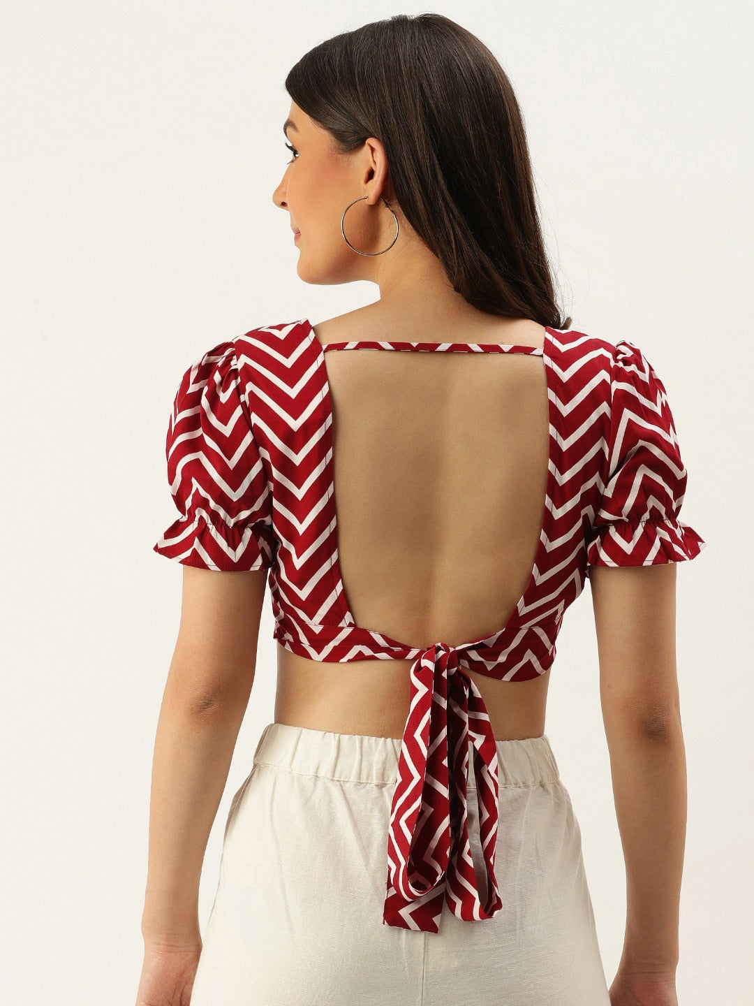 Want a fashionable piece for your summer wardrobe collection that never goes out of style? This geometric printed top by Berrylush is iconically designed to reflect confidence and style. Features a cropped length silhouette that accentuates your midriff for a trendy appeal. Crafted with woven crepe material that helps keep you comfortable throughout the day. The maroon and white color combination makes its geometric print stand out. The quick-drying properties of the material offer enhanced comfort even during warm weather conditions. Complemented with a square neckline and short puff sleeves, this cute top is perfect for pairing it with our best-seller high-top skirt and high heel sandals.