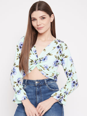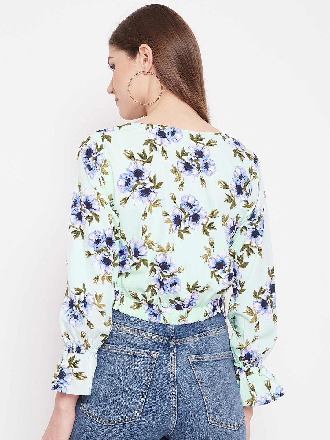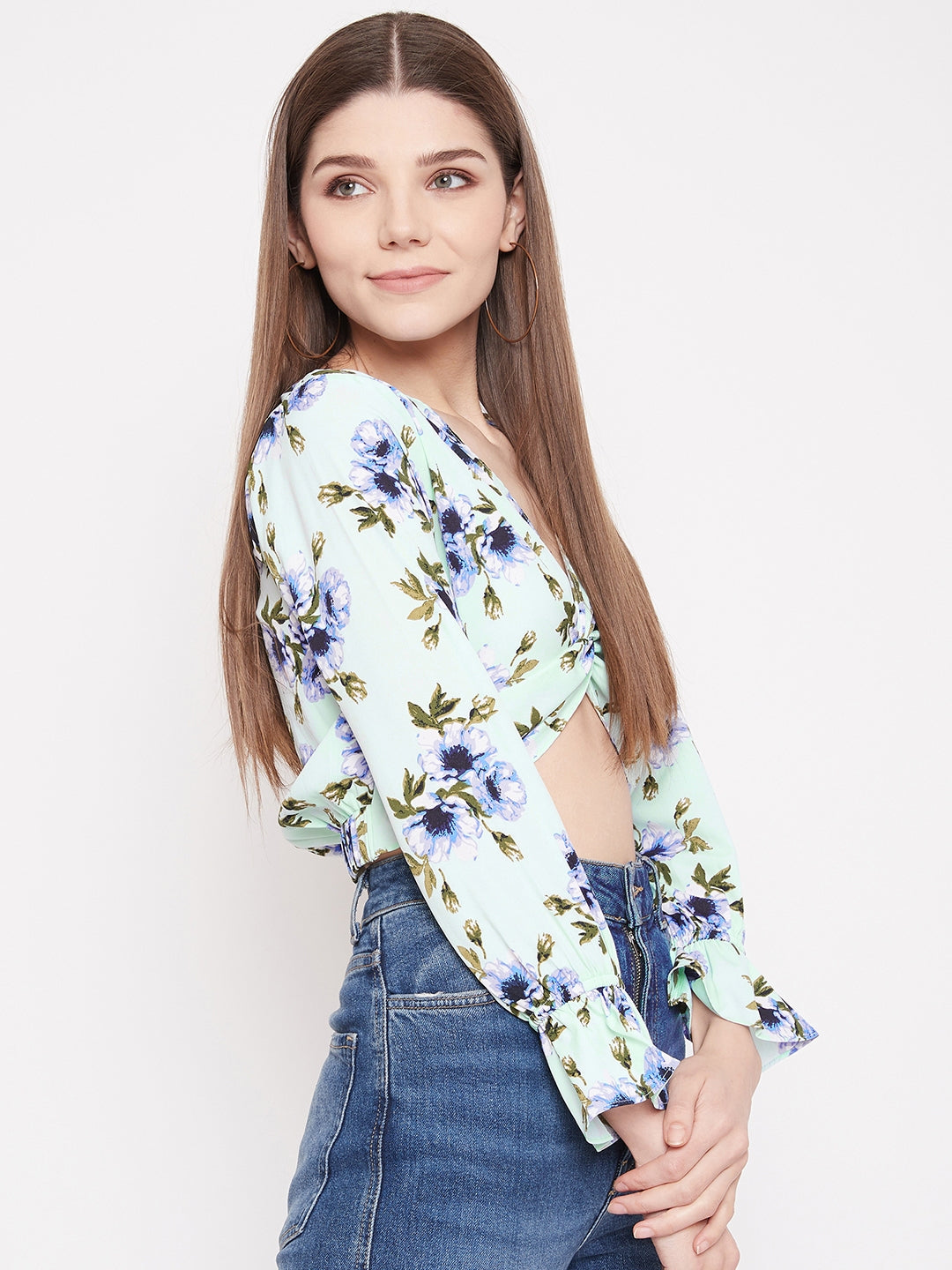 Leave your date speechless with just the sight of you in the Berrylush Green Floral Printed Front Twist-Knot V-Neck Top! We love a "going-out top", and that's exactly what you'll get from this sleek polyester crepe fabric with its flirty V-neckline, cropped bodice, and front twist-knot that flows into a gorgeous sea green color. Wrap detailing at the front, floral-inspired print, and long bishop sleeves, making this top a must-have addition to your weekend looks. Play up your feminine side and don this versatile top with a charming skirt and chic blocked heels.