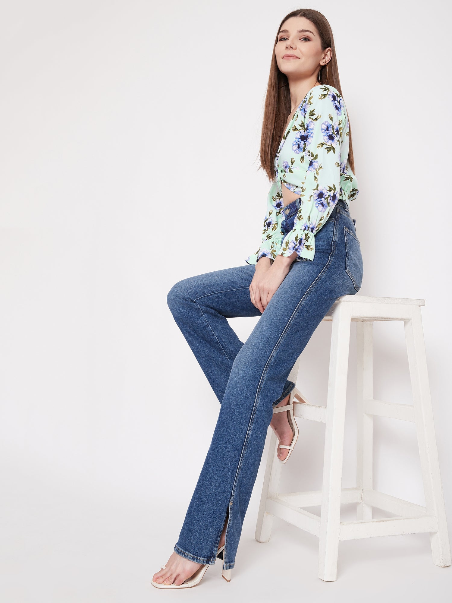 • This cropped-length top matches well with high-waisted jeans for a stylish look