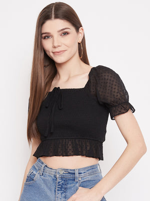 Berrylush Women Solid Black Lace Tie-Up Smocked Crop Top
