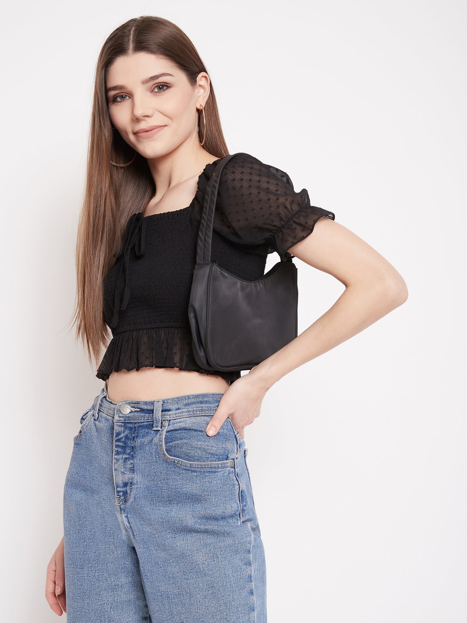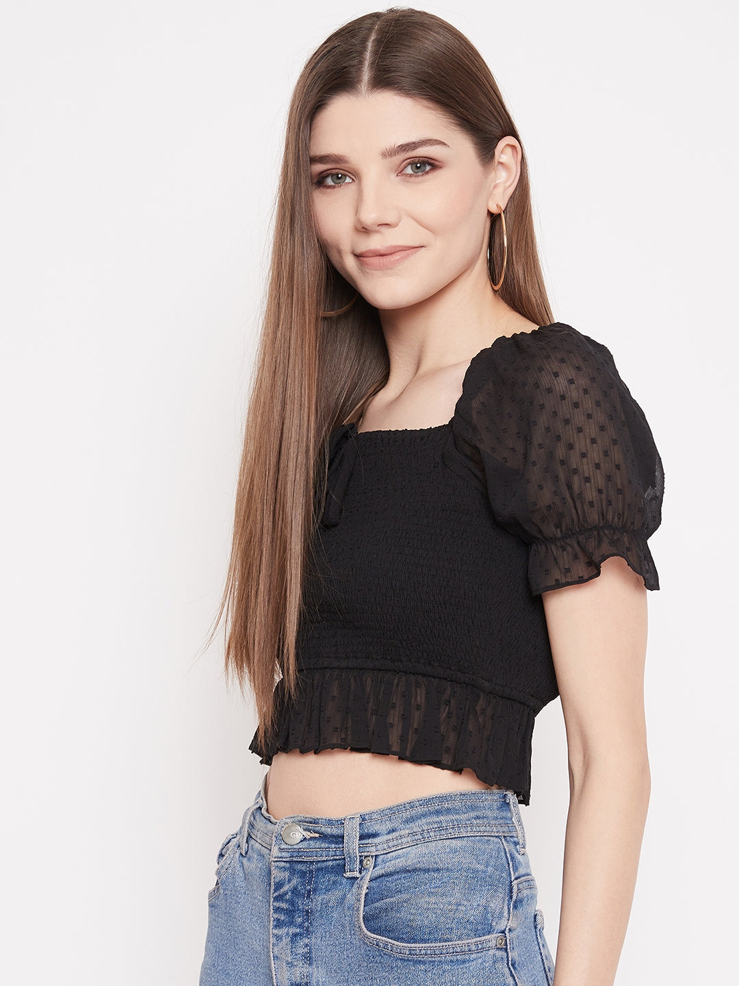 A cute smocked crop top by Berrylush has some exciting features that will make it your favorite piece for any occasion. Its soft georgette fabric assists in keeping you relaxed and comfortable in warm weather conditions. It is designed with a smocked bodice and lace detailing on puffed short sleeves to create a charming appearance. Tie-up closure at the chest provides a secure and adjustable fit. A combination of ruched detailing at the hem and cropped length makes it perfect for casual outings. Team up this gorgeous top with denim high-waisted jeans and cool sneakers for a stylish look.
