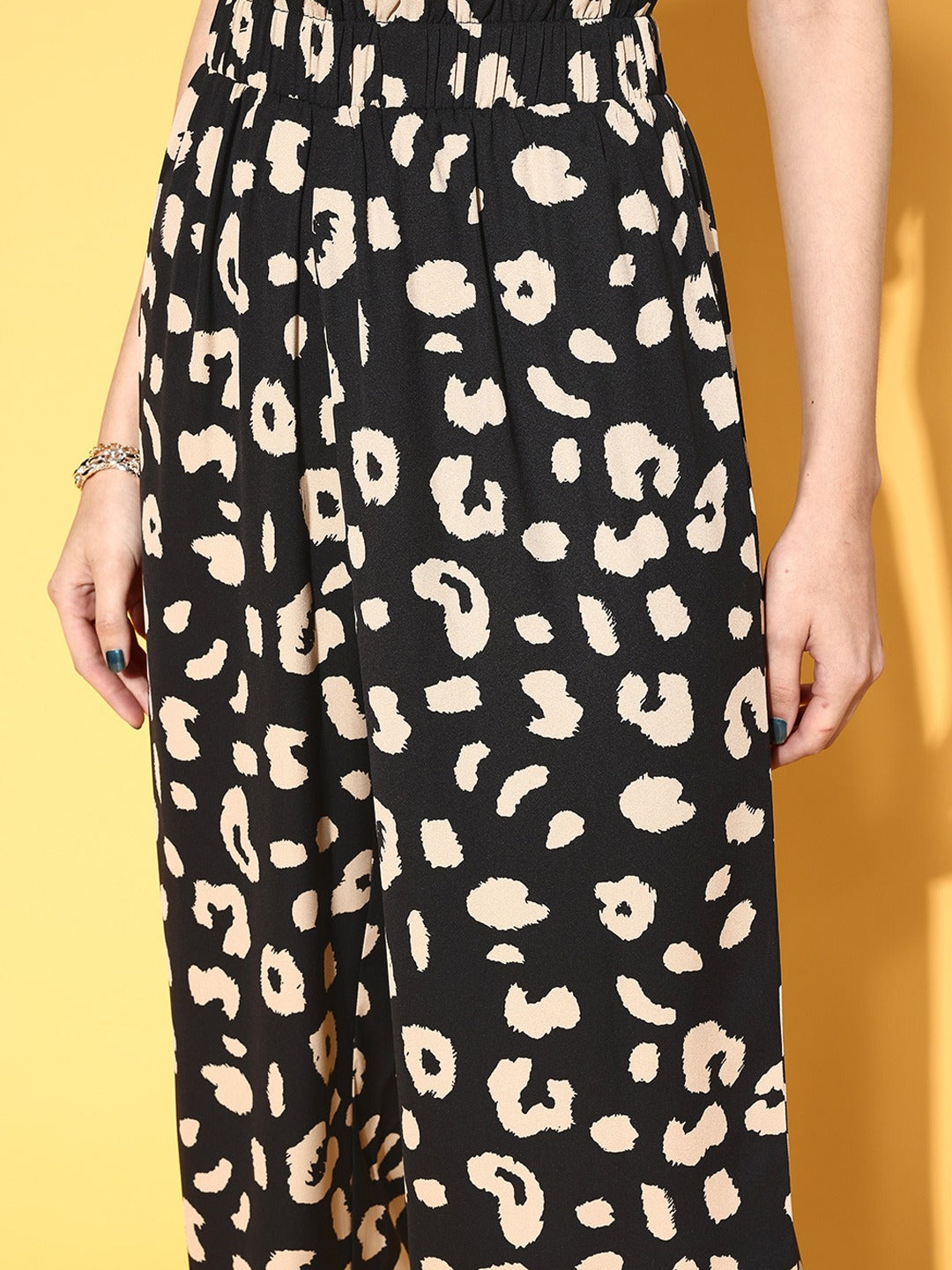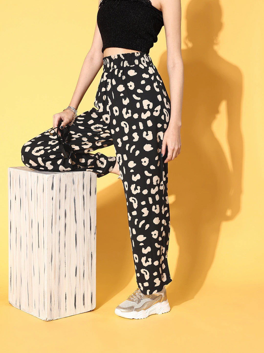 Gift your casual wardrobe the charm of contemporary addition with these fashionable Black & Beige Animal Printed High-Rise Elastic Waist Regular Trousers designed by Berrylush. These trousers are mostly admired for their amazing beige animal print in a charming black shade that makes it look trendy and gives off a ritzy vibe. Gracefully designed with a high-rise waist to lend you a slimmer look without any bulging appearance at the waist area. Moreover, the flat-front design with no pleats makes these trousers appear to consist of a parallel styling with an edgy finish. Complete your laid-back weekend look with a slim-fit crop top, a pair of sneakers, and a stylish side bag for a fashionable look.