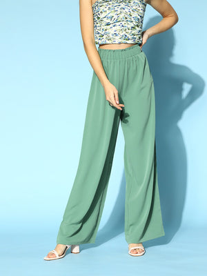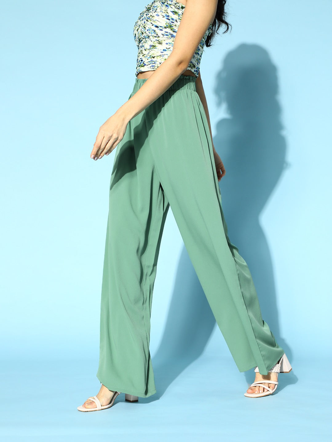 Berrylush Women Solid Green Flare Fit High-Rise Waist Plain Trousers