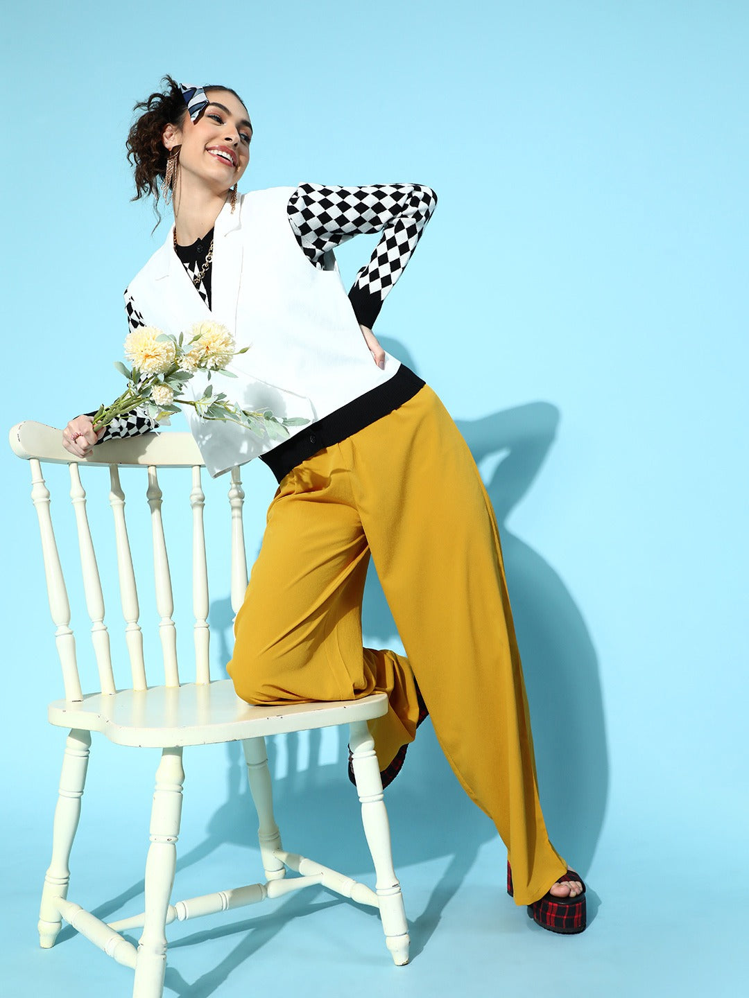 Exemplify your outdoor edit with sophistication and elegance with these mesmerizing Solid Mustard Yellow Loose-Fit High-Rise Elastic Waist Pleated Trousers designed by Berrylush. Specifically profiled in a loose fit to lend these trousers a relaxing style that would keep your legs comfortable while walking along with a smart appeal. Fashioned in regular length to make these trousers appear classy and to get you a modest style look. Also, these trousers are the style with flat-front with no-pleats design for a smooth silhouette and a straight design. You can wear these trousers with a black fitted top, a light jacket, a pair of trendy wedges and a fancy side bag to get a fashion-flattering appearance.