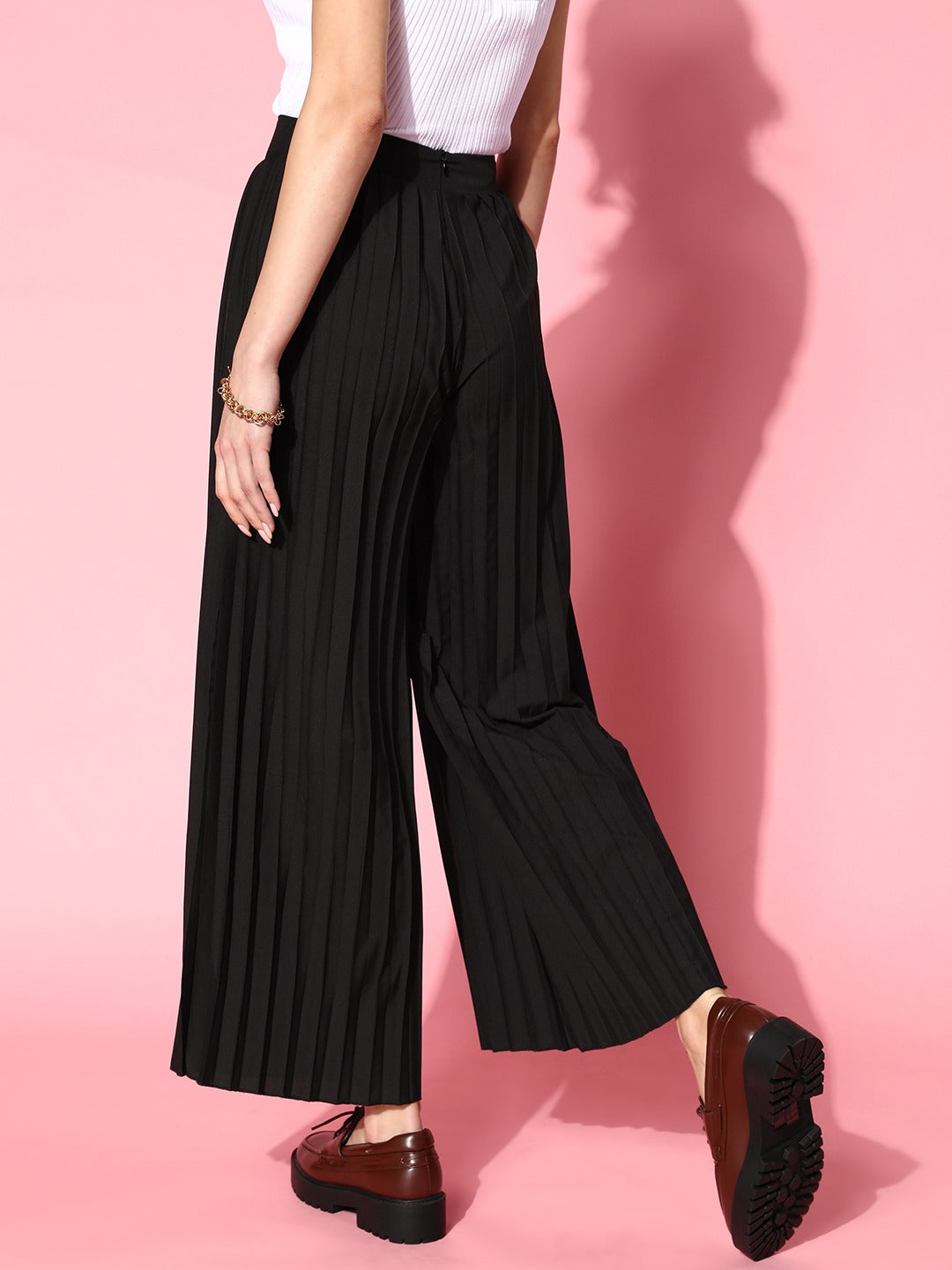 Berrylush Women Solid Black High-Rise Waist Slip-On Woven Pleated Regular Trousers