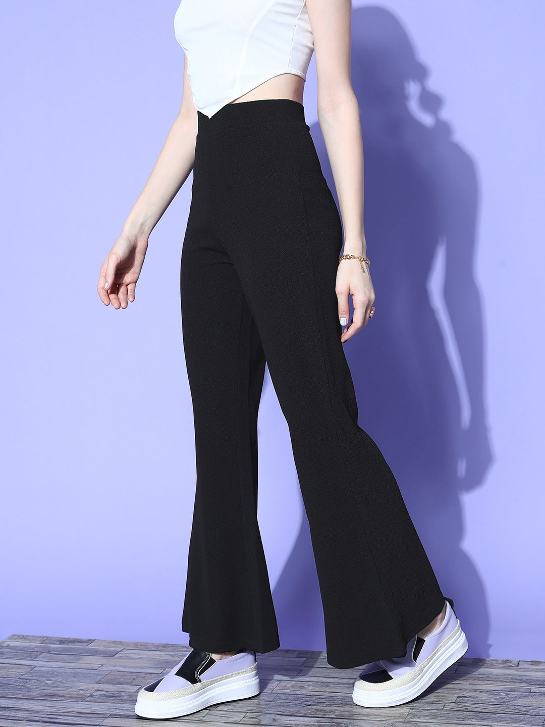 Berrylush Women Solid Black High-Rise Waist Slip-On Flared Regular Trousers