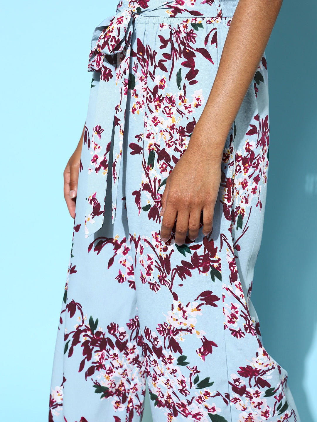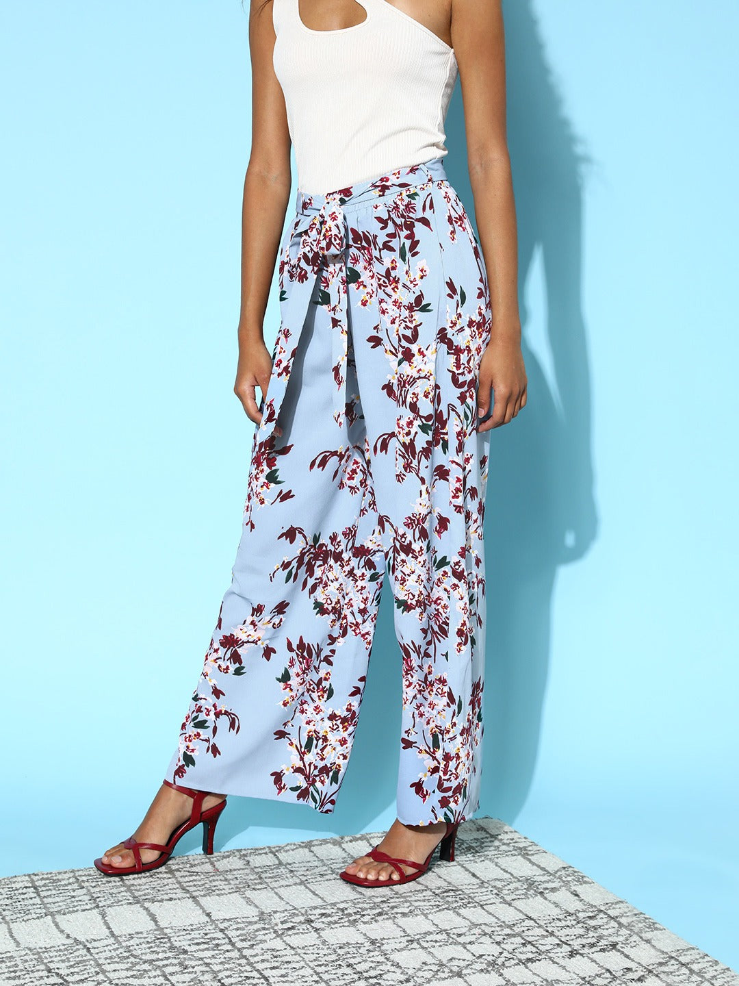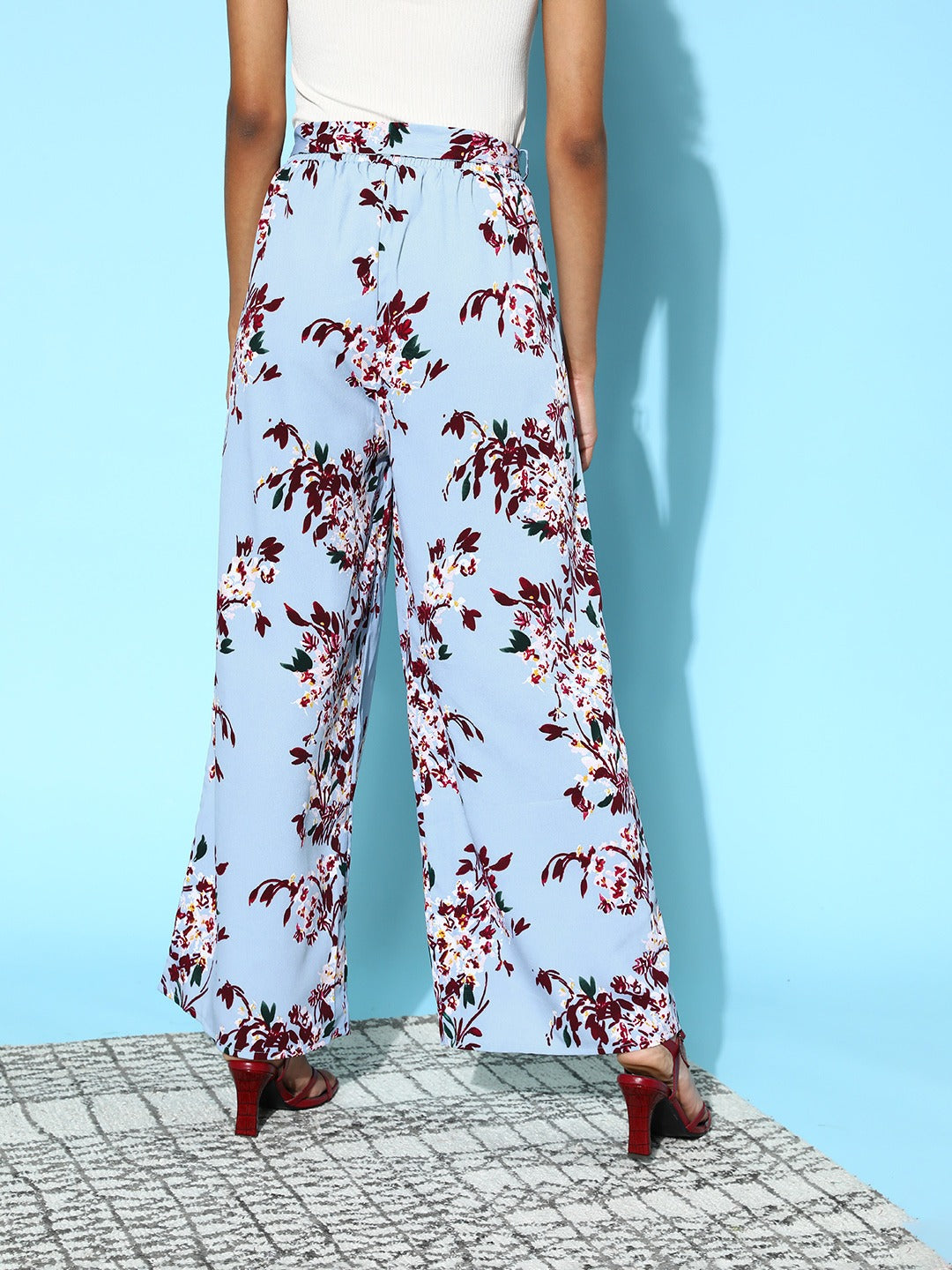Berrylush Women Blue & Maroon Floral Printed Tie-Up High-Rise Waist Flared Parallel Trousers