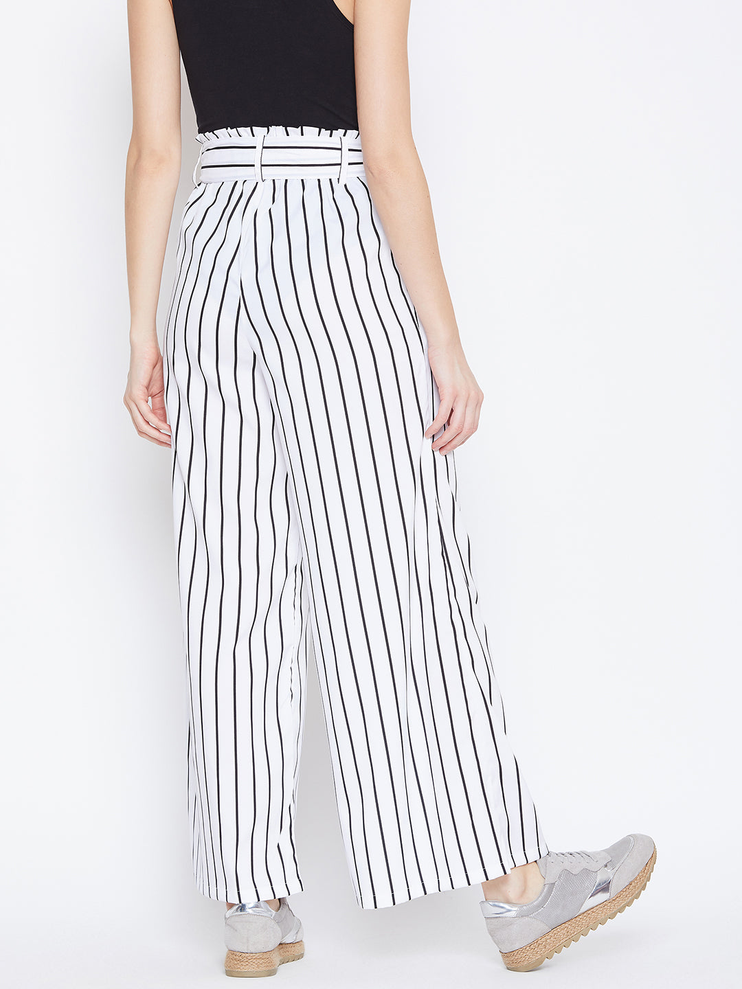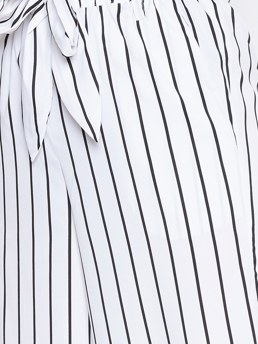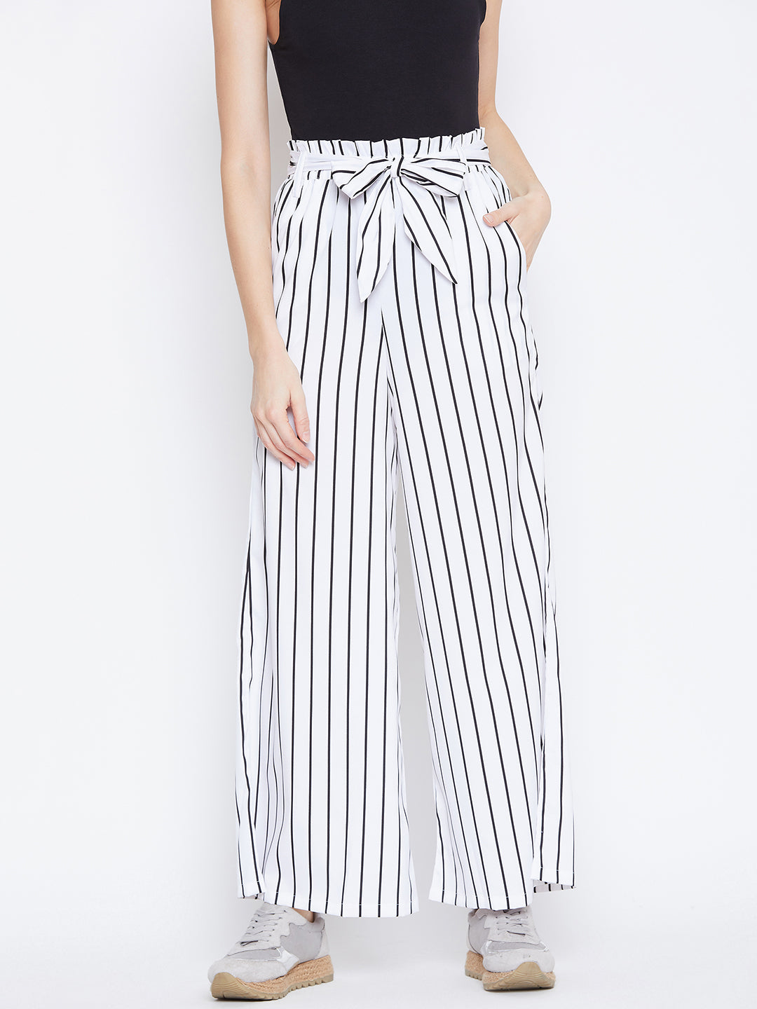 Berrylush Women White & Black Striped Pattern Waist Tie-Up Mid-Rise Trousers