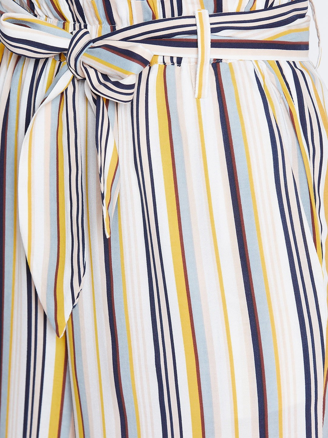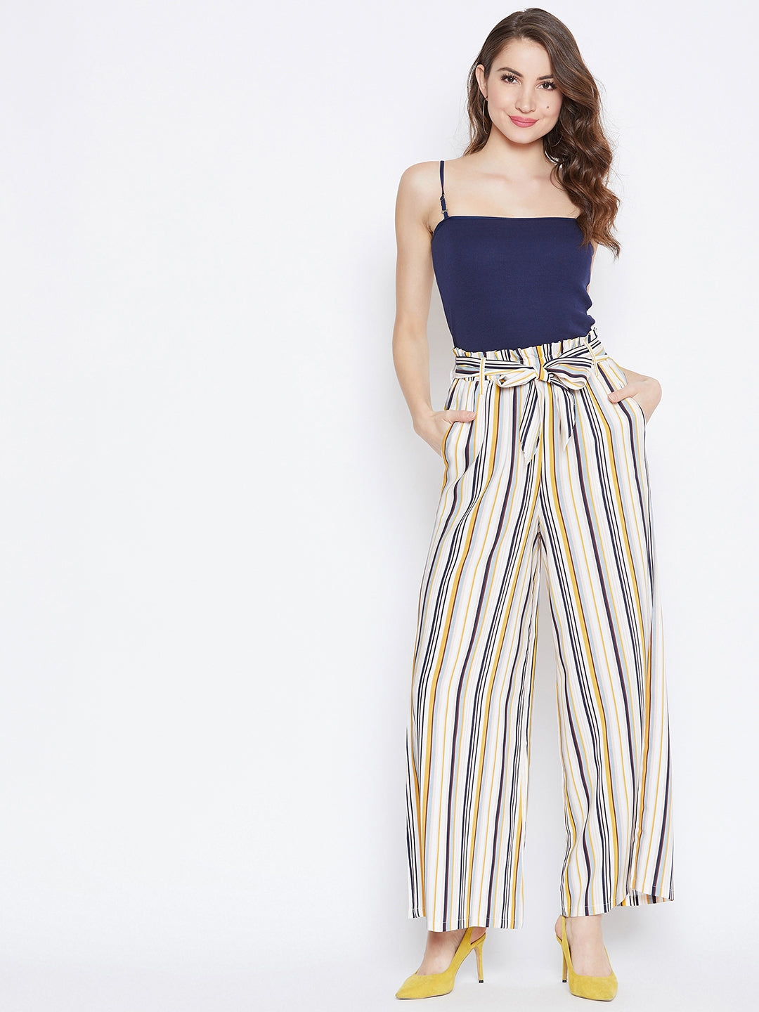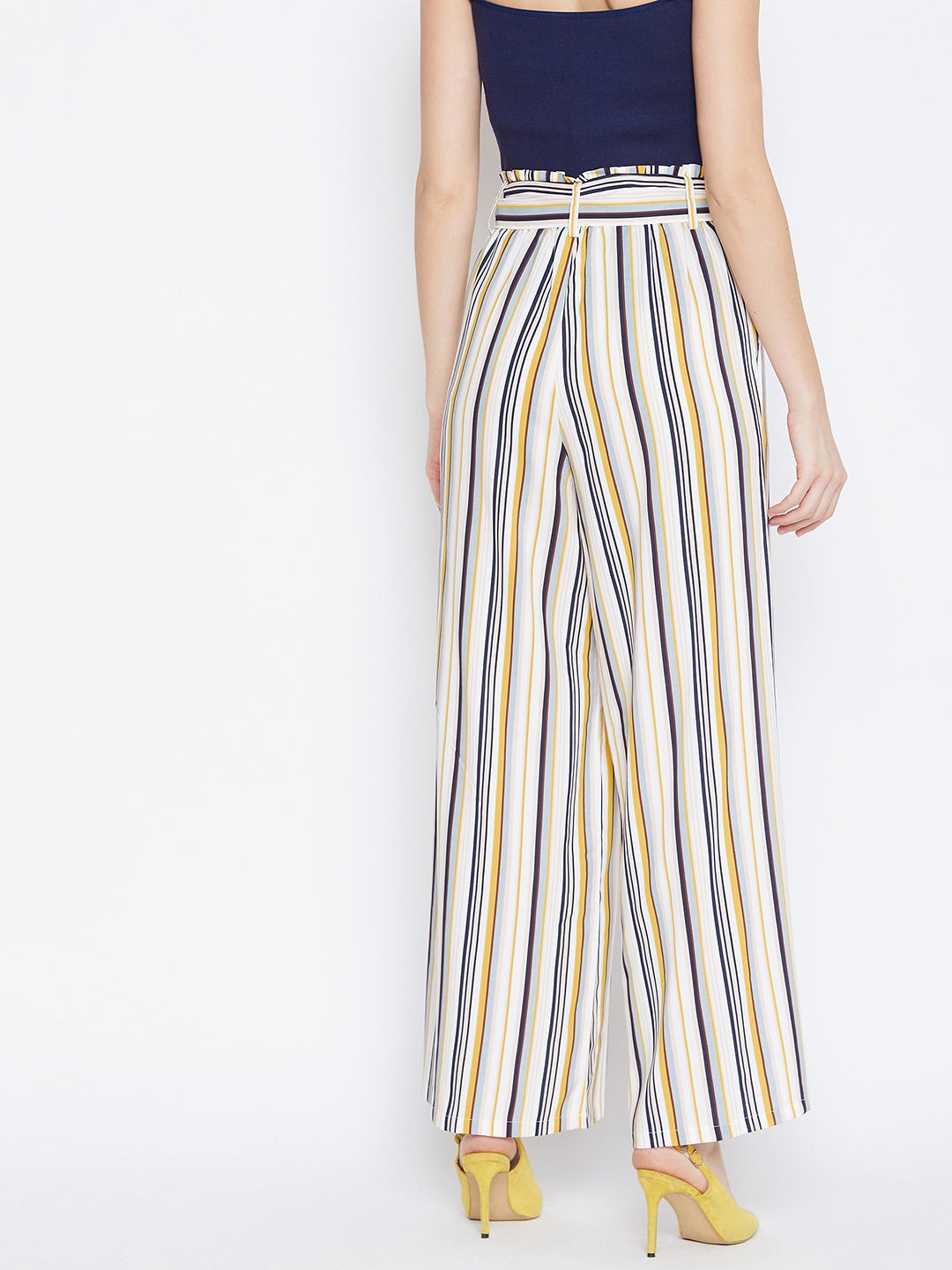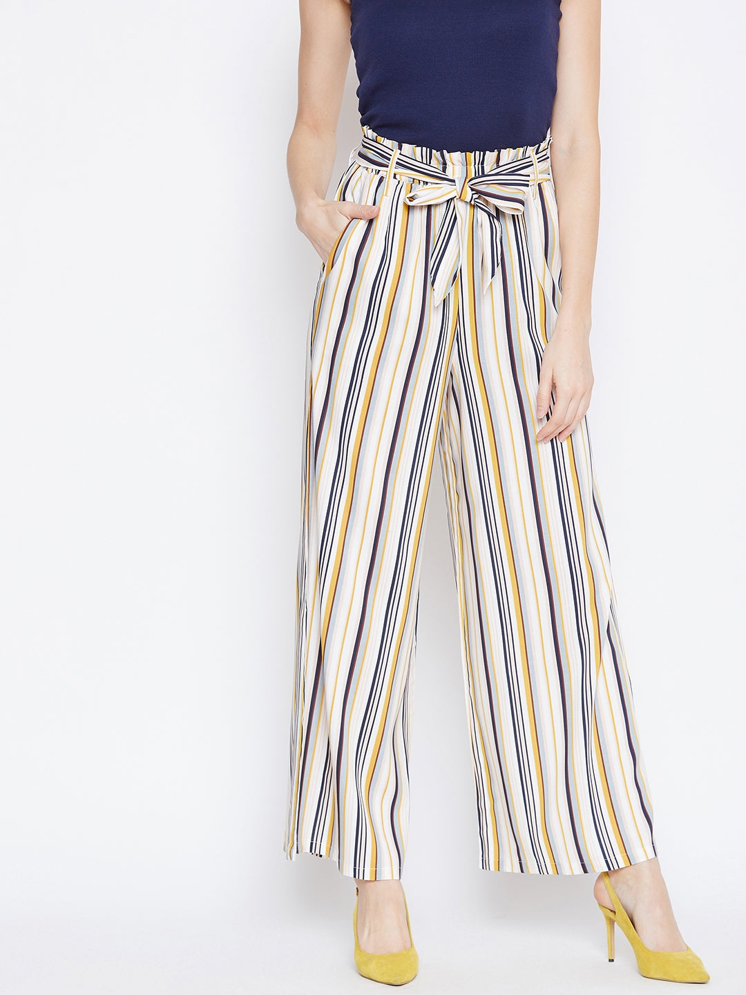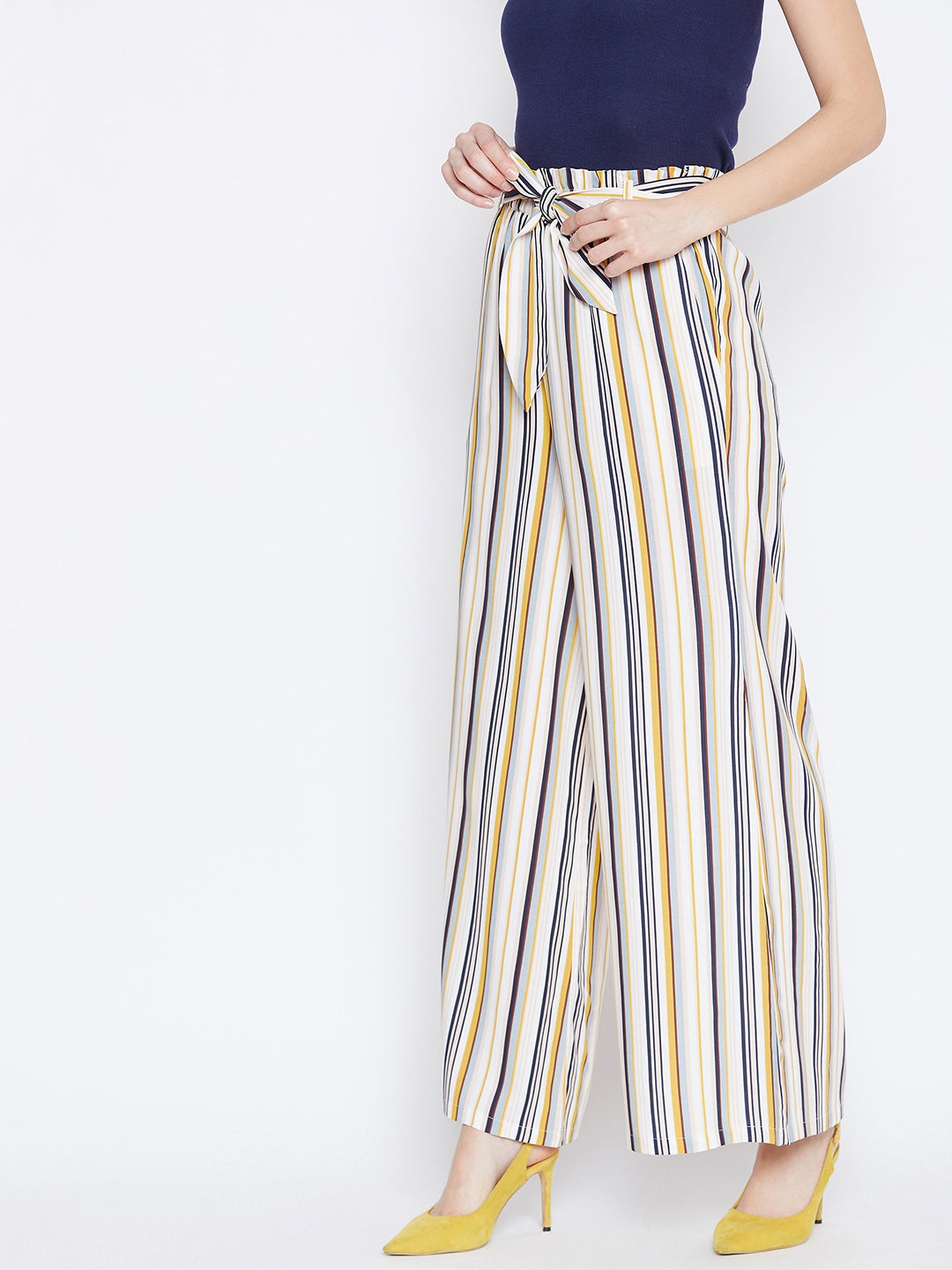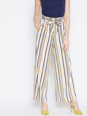 Berrylush Women Multicolour Striped Pattern Waist Tie-Up Mid-Rise Trousers