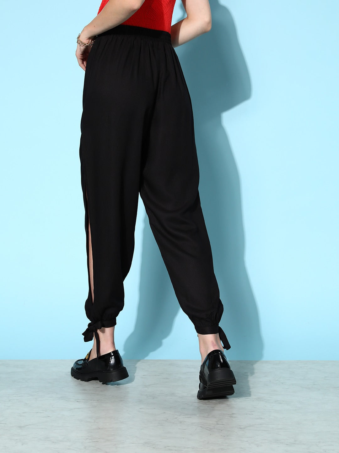 Berrylush Women Solid Black High-Rise Waist Thigh-High Slited Relaxed Trousers