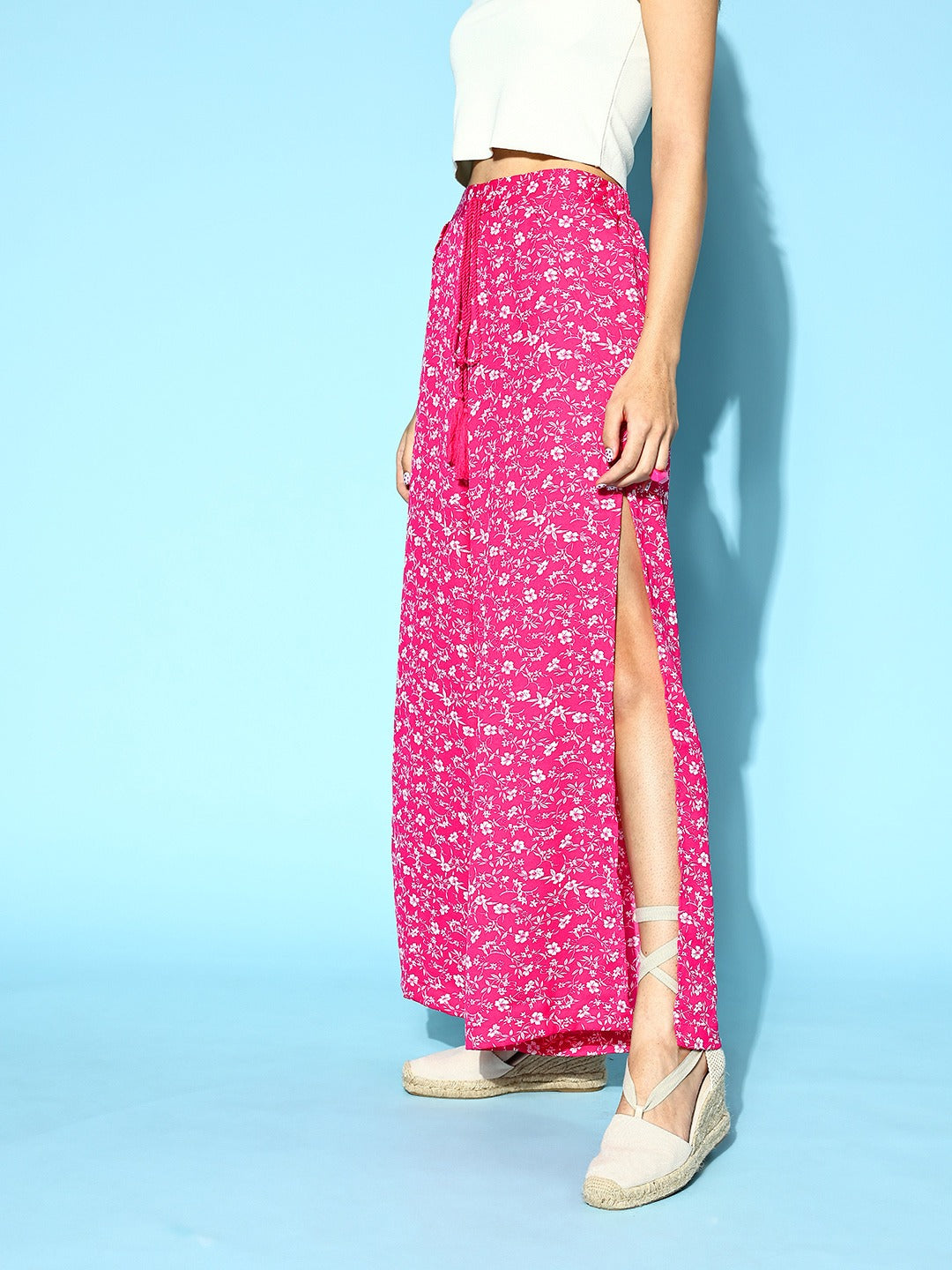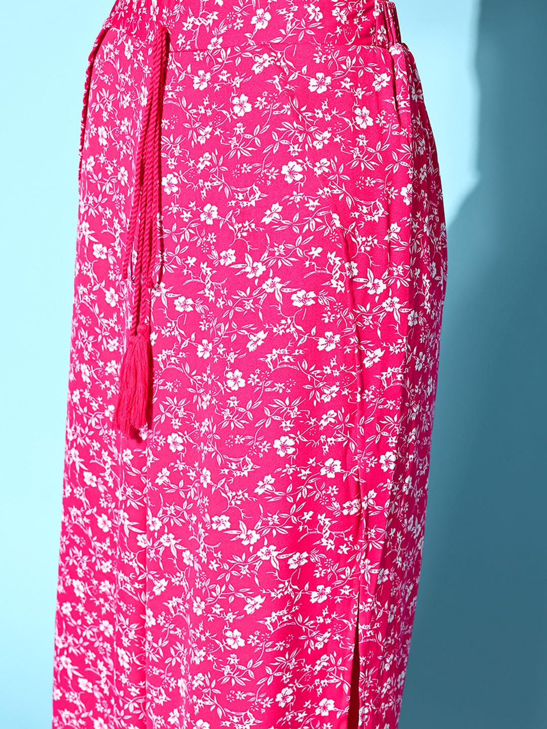 Berrylush Women Pink & White Floral Printed Mid-Rise Tie-Up Waist Side-Slit Tapered Regular Trousers