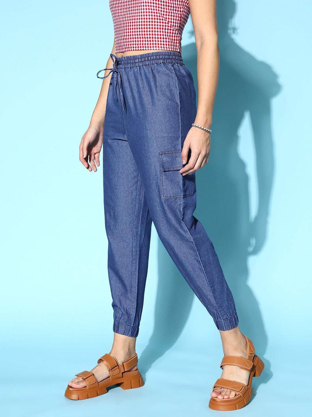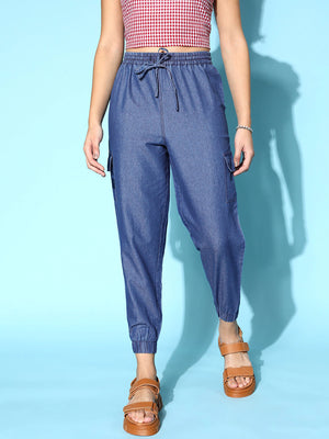 Berrylush Women Solid Navy Blue Tie-Up High-Rise Waist Chambray Regular Utility Trousers
