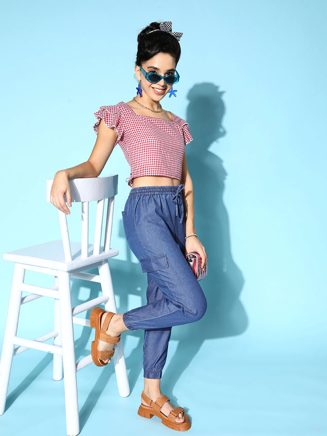 Slay in style with athleisure and relaxing fits by adding to your cart these chic Solid Navy-Blue Utility High-Rise Regular Length Trousers from the latest casual wear collection of Berrylush. Punctuated with the finest cotton material to keep these trousers are breathable and flexible for a comfy feel and hassle-free movements. Designed with plain features that lend these trousers a smart and opulent style note. Moreover, the flat-front-front design gives these trousers a flattering appeal with a slimmer cut. Enjoy your laid-back weekend in style by wearing these trousers with a tank top and comfortable sandals.
