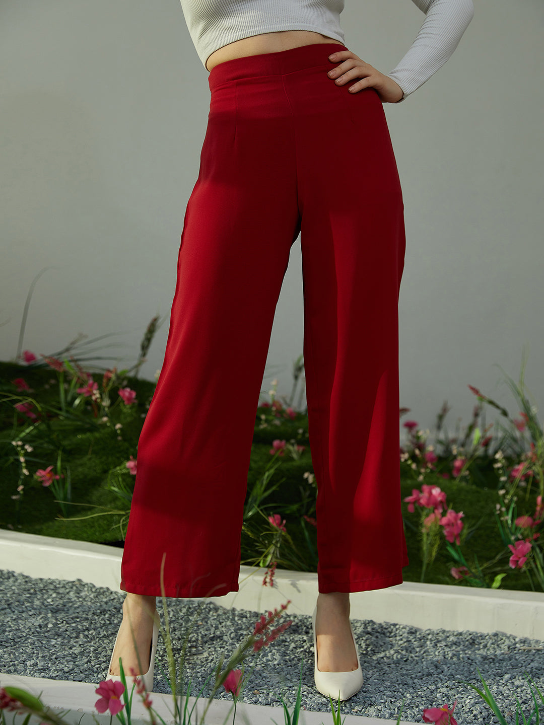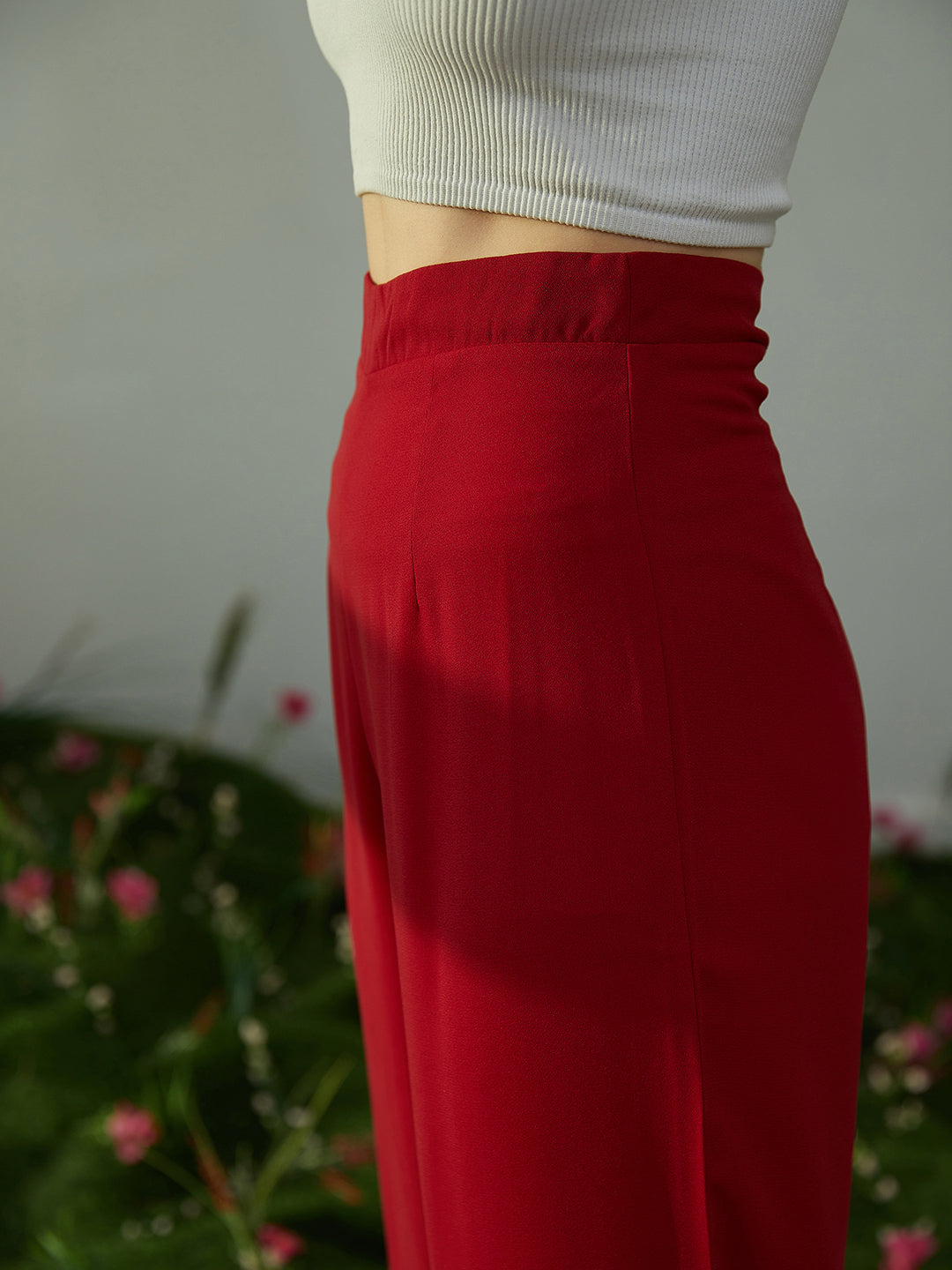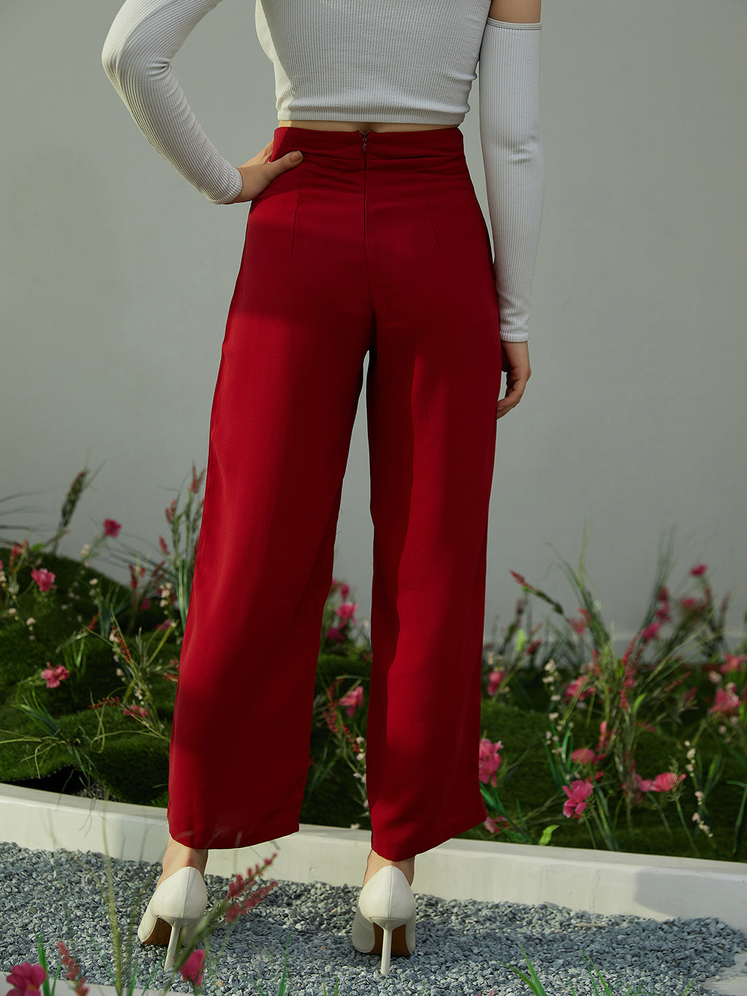 Give your capsule wardrobe an effortless yet versatile upgrade this season with the addition of this cinematic Solid Red High Waist Wide Leg Regular Pants from the latest print and pattern collection of Berrylush. Tailored in a parallel profile that gives these pants a straight silhouette that elegantly flatters your natural curves. Showcasing concealed zip closure that lends these pants easy to wear style with more aesthetically pleasing appeal. Moreover, the woven weave revamps the structural integrity of these pants with seamless stitching. You can wear these pants with your favourite top, block heels, silver hoop earrings, and a classy side bag for a bewitching look.