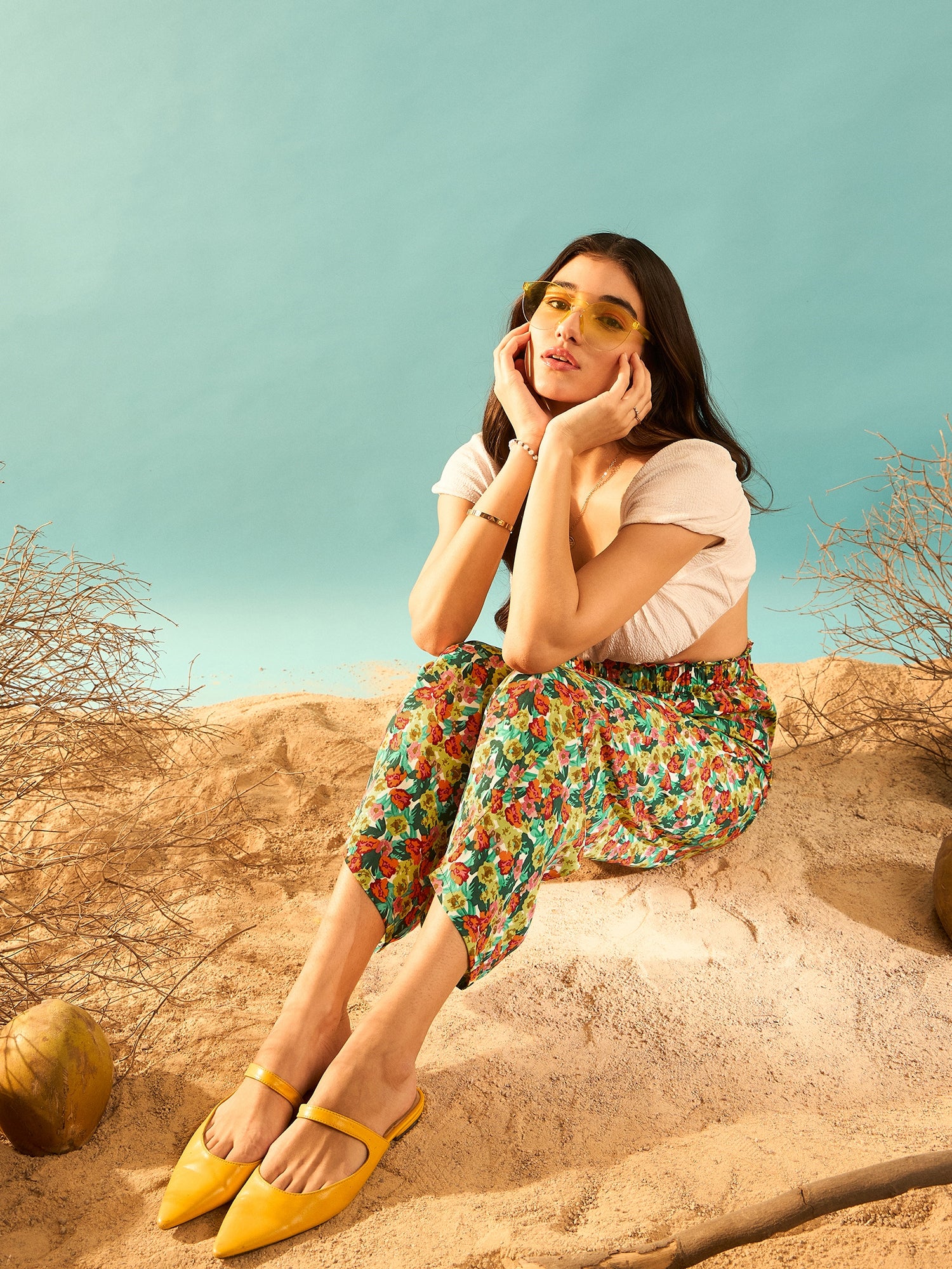 Step into a world of vibrant elegance with Berrylush's Red, Yellow, & Green Floral Printed High-Rise Elastic Waist Slip-On Regular Parallel Trousers. Infused with an exquisite mix of red, yellow, and green hues set against a sophisticated floral print, these trousers celebrate your love for colour and pattern. Designed for comfort without compromising on style, the high-rise elastic waistband offers an effortless slip-on fit that flatters every figure. Crafted from premium polyester with a woven texture ensures durability while maintaining opacity for everyday wearability. Whether you’re dressing up for casual outings or relaxing weekends at home—these regular-fit trousers add just the right touch of joy and sophistication to your wardrobe.