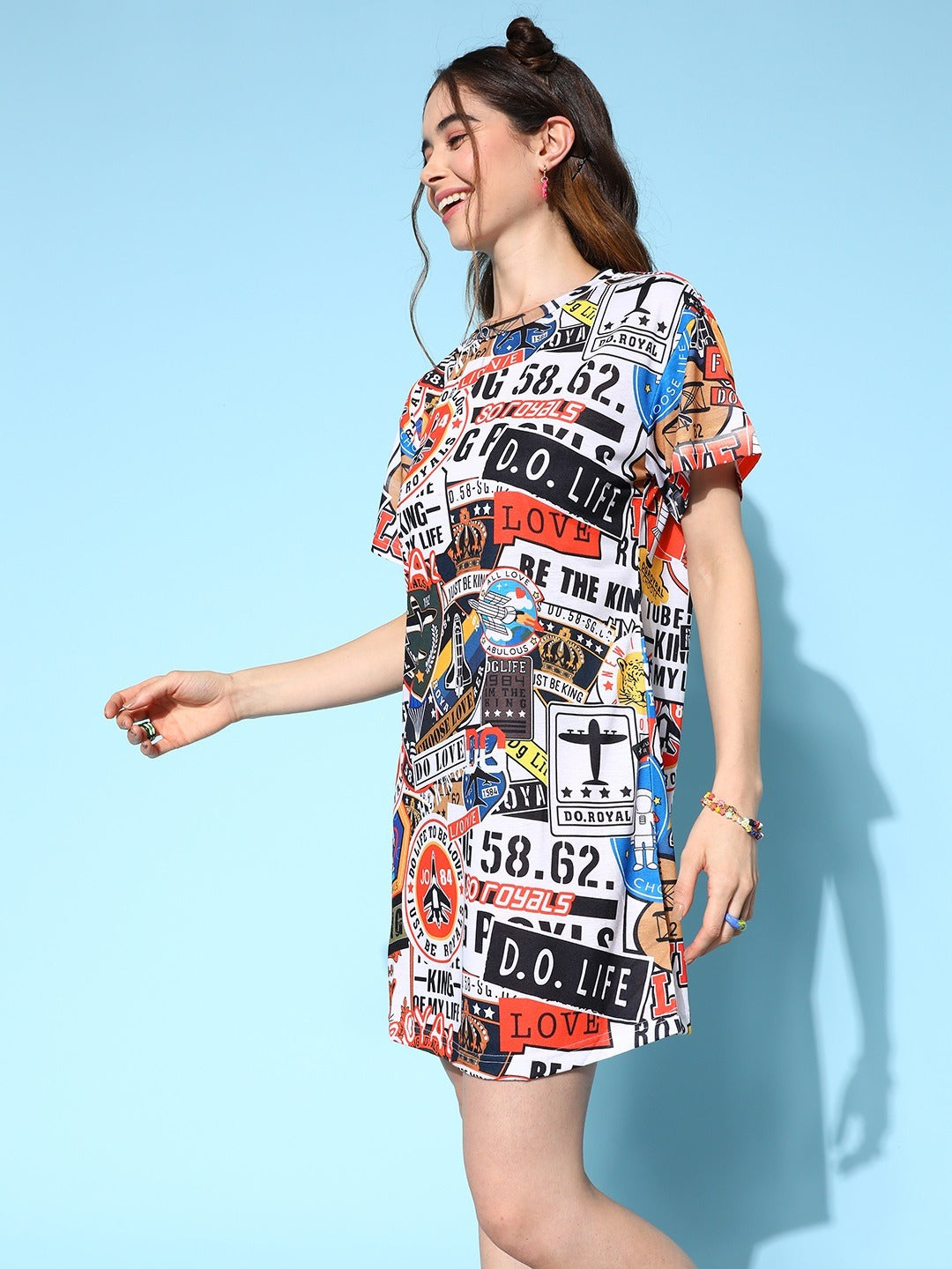 Amp up your summer casual style to a whole new height with the addition of this marvellous White & Multicolour Conversational Printed Round Neck Short Sleeves Longline T-Shirt from Berrylush. Designed with a longline length that gives this t-shirt a cool and trendy appearance with a resemblance to a dress. Styled with a round neck design that lends your neckline universally flattering appeal without exposing much skin. Spun from lightweight polyester fabric to offer highly stain-resistant and quick-drying characteristics to this t-shirt. Mix and match this t-shirt with your favourite shorts, a pair of white sneakers, pink hoop earrings, and your favourite side bag to create a stunning look.