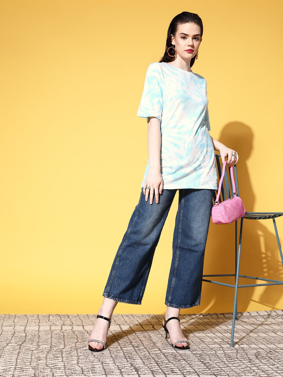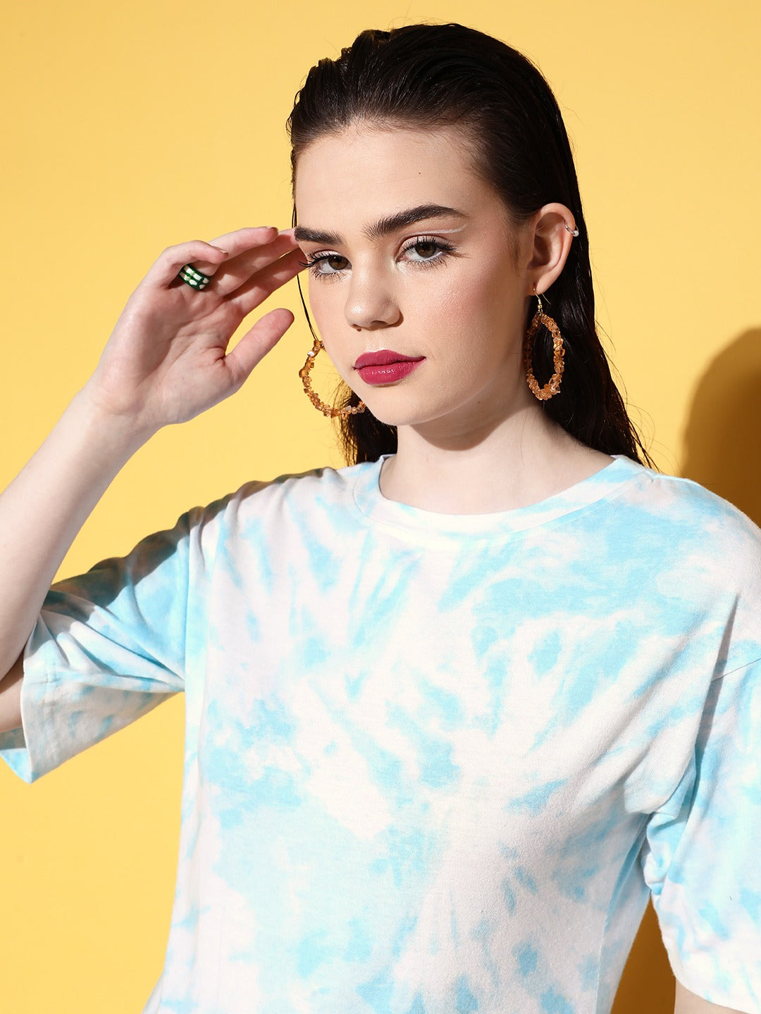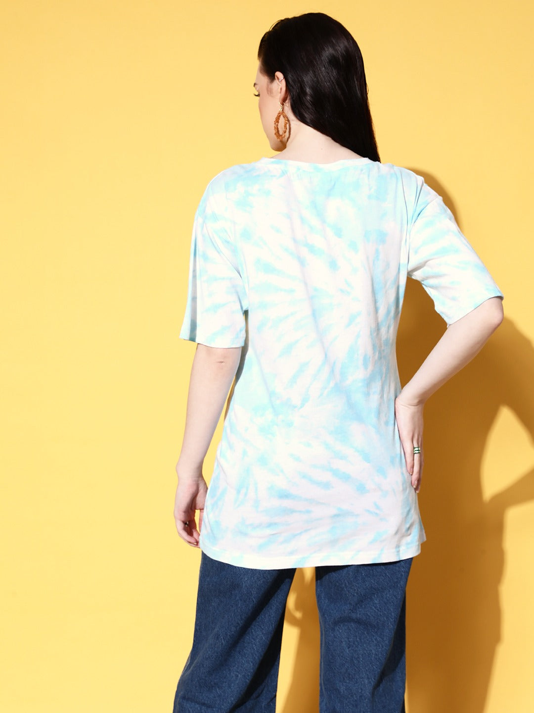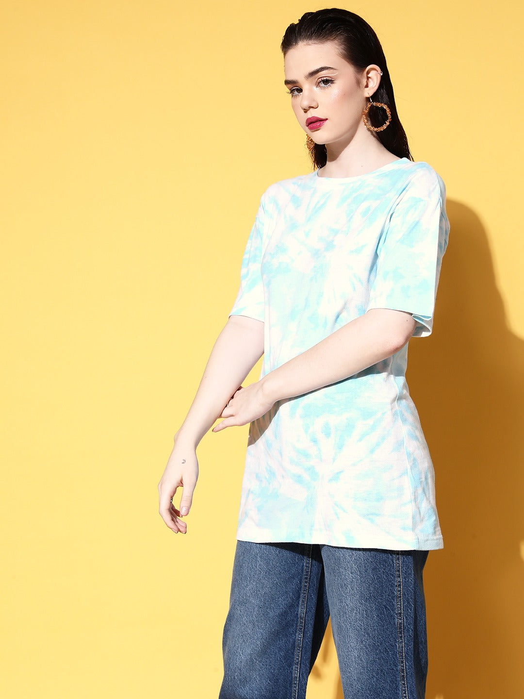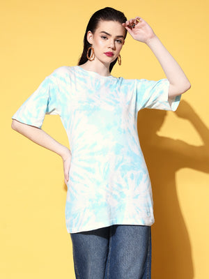 Berrylush Women White & Blue Tie-Dye Printed Round Neck Drop-Shoulder Cotton Longline T-Shirt