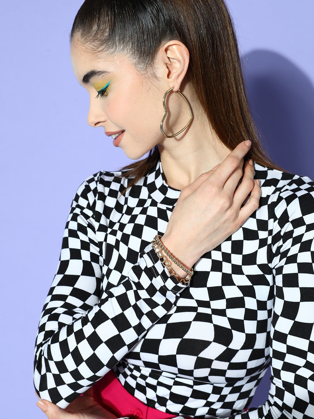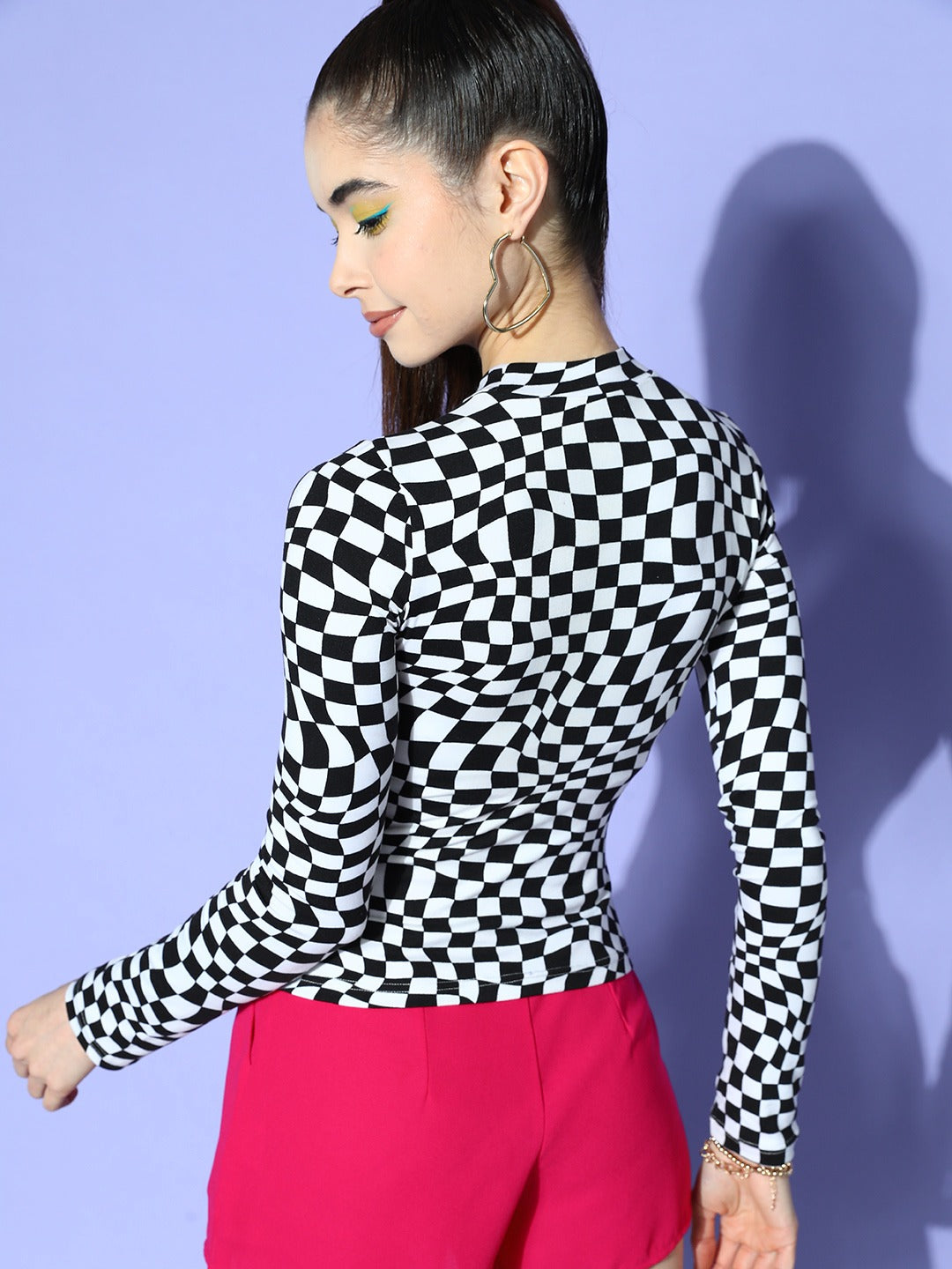 Berrylush Women White & Black Checked Pattern High Neck Slim-Fit Knitted Regular T-Shirt