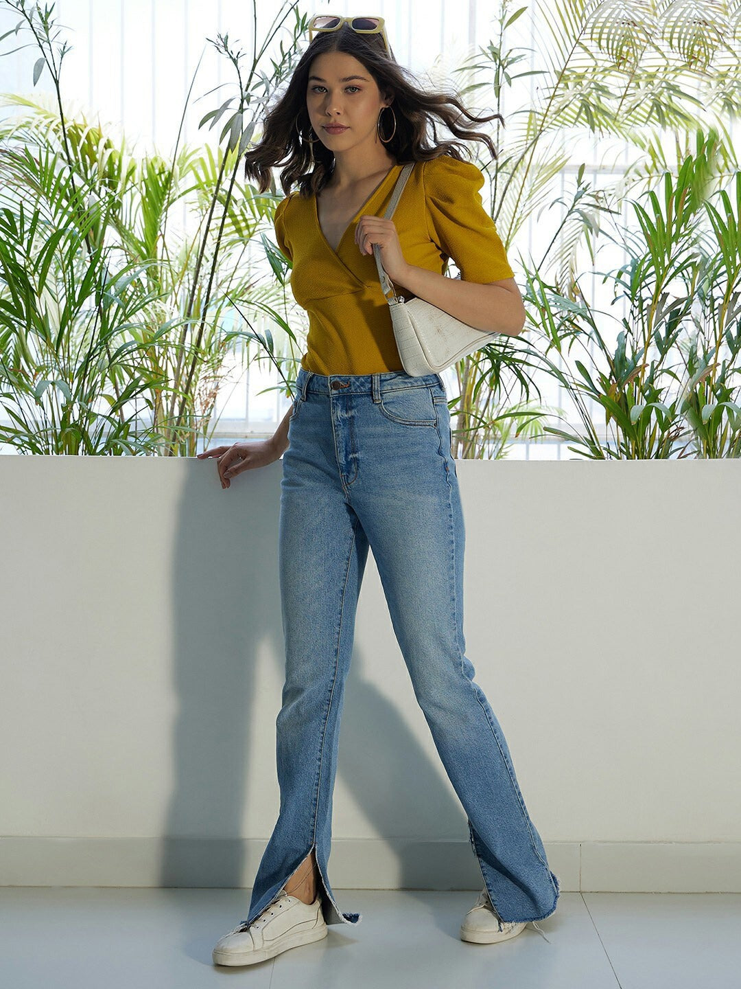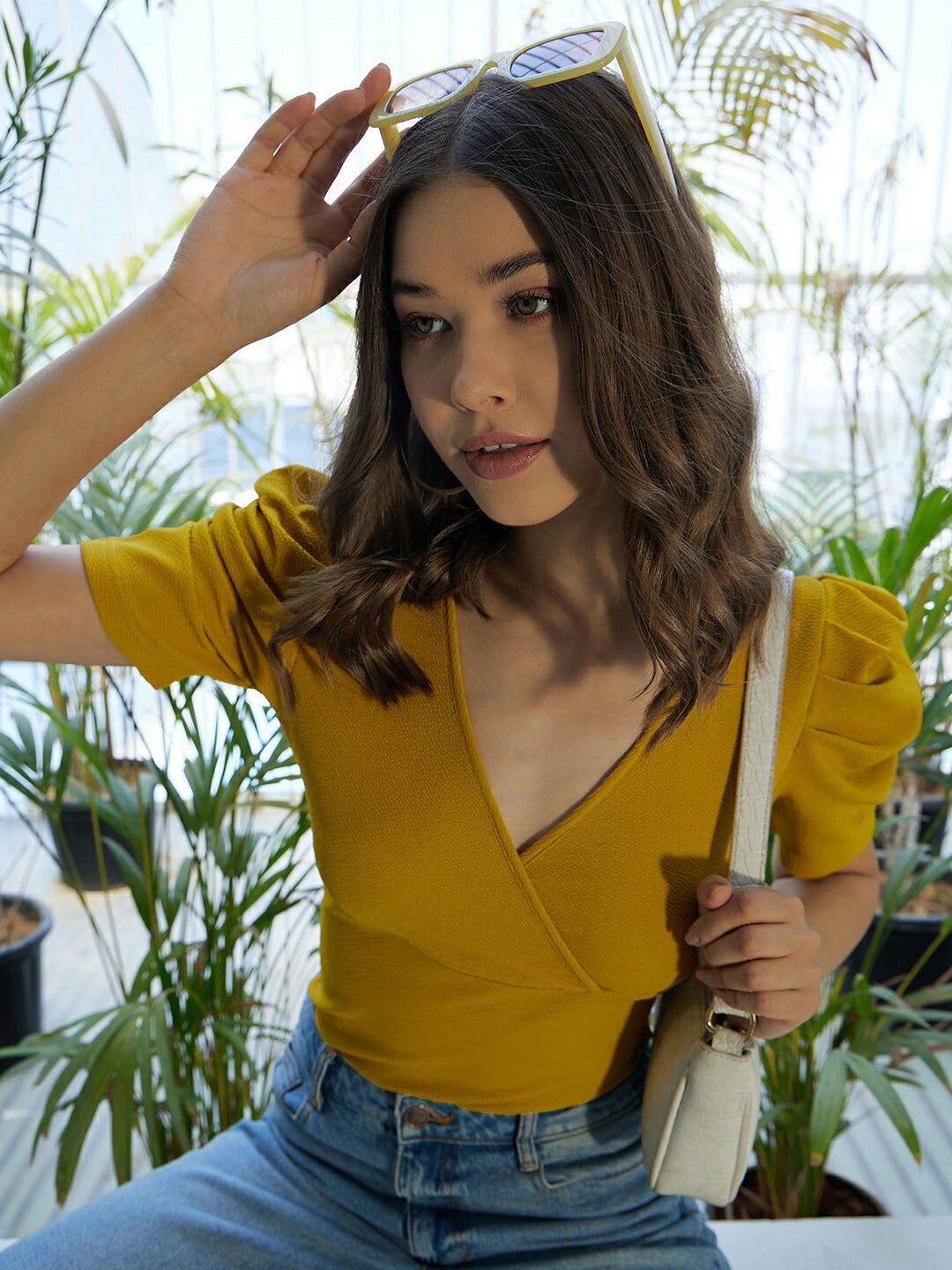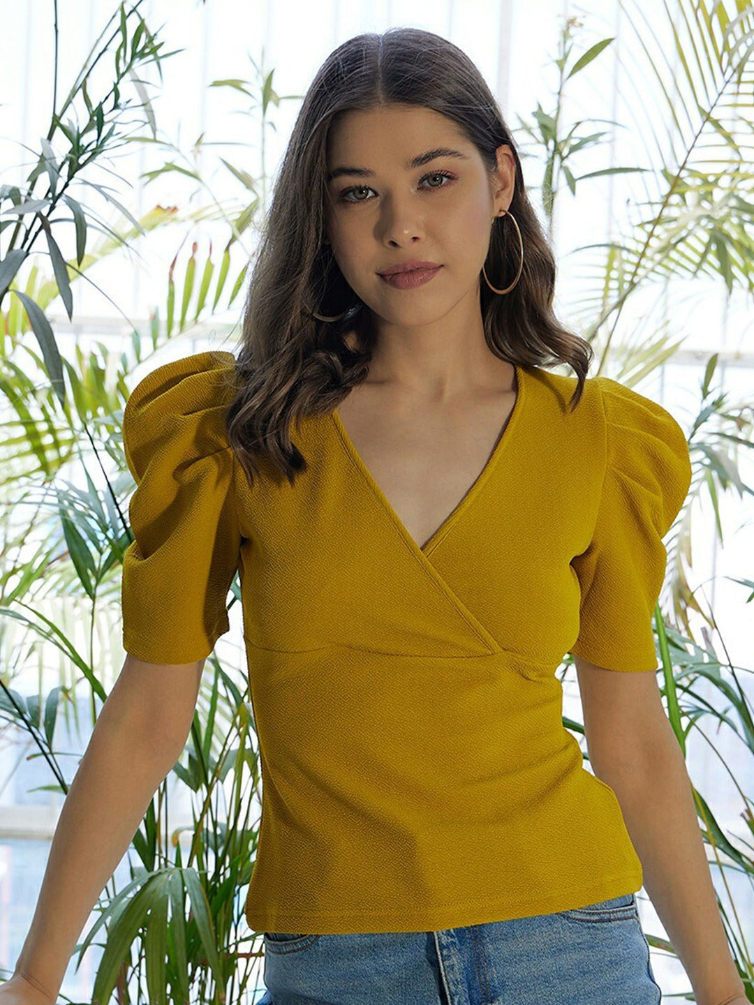 Push your fashion lifestyle to a whole new level with this gorgeous Solid Yellow V-Neck Puff Sleeves Slim Fit Wrap Knitted Regular T-Shirt designed by Berrylush. Spotlighting a V-neck design that gives a wider space and alluring appeal to your neckline and shoulders. Spun from polyester fabric that supports odour-free features along with moisture-wicking properties. Moreover, the short-puffed sleeves help to keep your arms warm and cosy. Partner up this stylish t-shirt with a checked mini skirt, minimalistic silver jewellery, and white sneakers to get a fashion-flattering appearance.