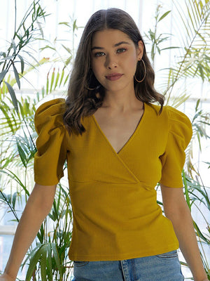 Berrylush Women Solid Yellow V-Neck Puff Sleeves Slim Fit Wrap Knitted Regular T-Shirt