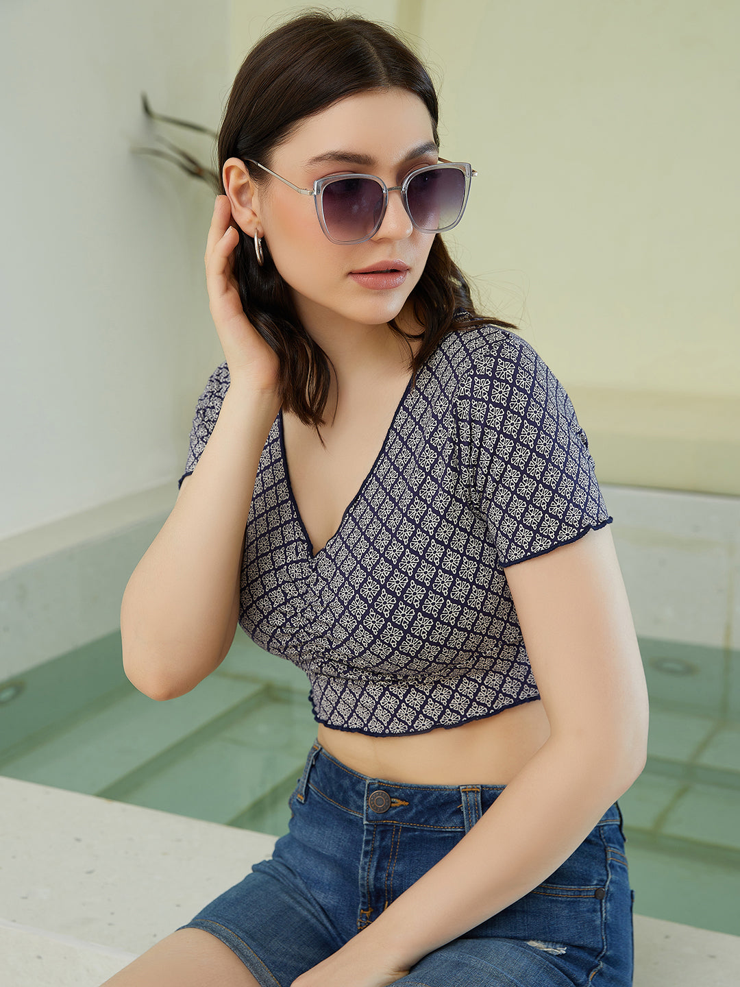 Redefine the art of fashion with eccentric and trendy signature pieces just like this beautiful Navy Blue Conversational Printed V-Neck Lettuce Trim Crop Top from the upgraded casual wear collection of Berrylush. Decked with navy blue and black conversational print that gives this top boho-chic appearance with cinematic design. Highlighting short-regular sleeves that offer your arms modest coverage with a refined sheen. The slim-fit design offers this contouring silhouette that effortlessly showcases your feminine figure. Enjoy your weekend on the beach side while looking glamorous by teaming this top with denim shorts, a pair of crocs, pearl stud earrings, and a cute tote bag.