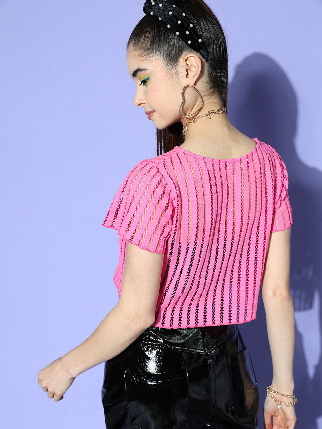Berrylush Women Pink Self-Design Pattern Round Neck Slim-Fit Semi-Sheer Knitted Crop T-Shirt