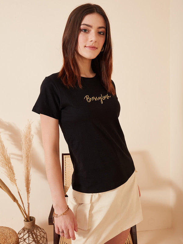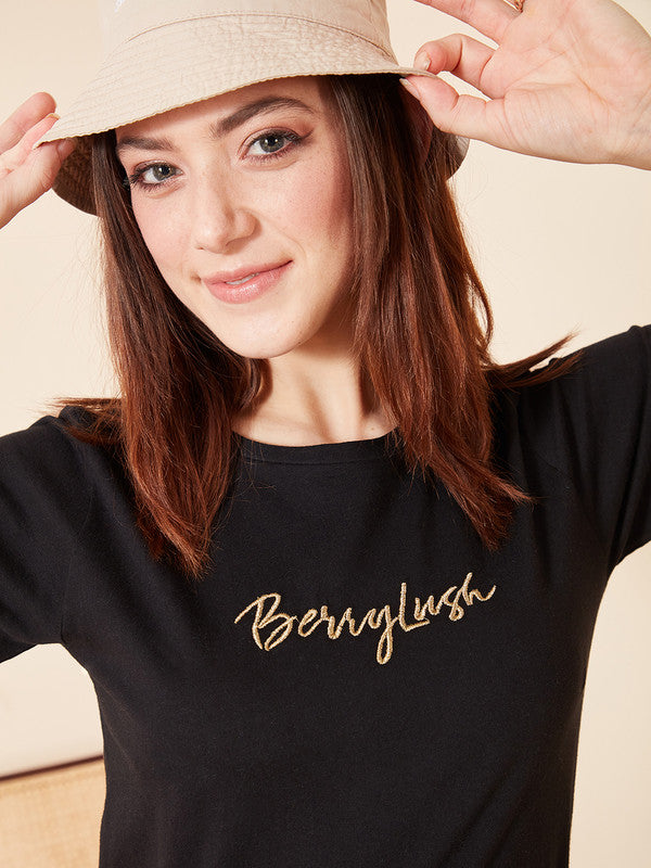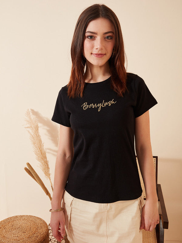 Berrylush Women Solid Black Round Neck Short Sleeves Logo Embroidered Regular T-Shirt