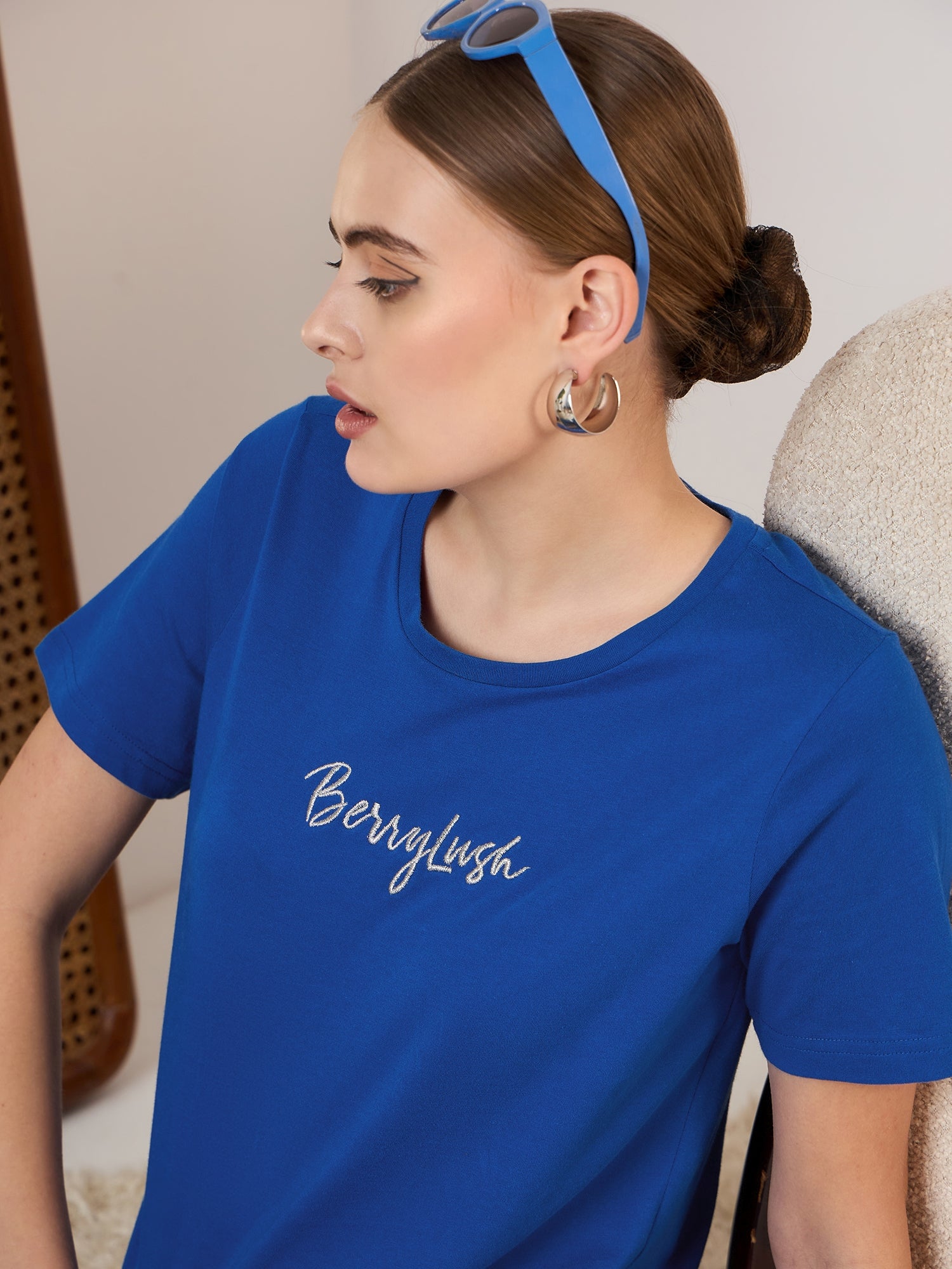 Berrylush Women Solid Blue Round Neck Front Brand Logo Short Sleeves Knitted Regular T-Shirt