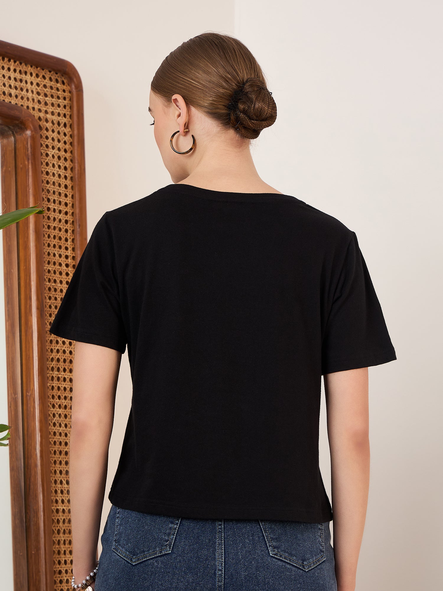 Berrylush Women Solid Black Round Neck Front Brand Logo Short Sleeves Knitted Regular T-Shirt
