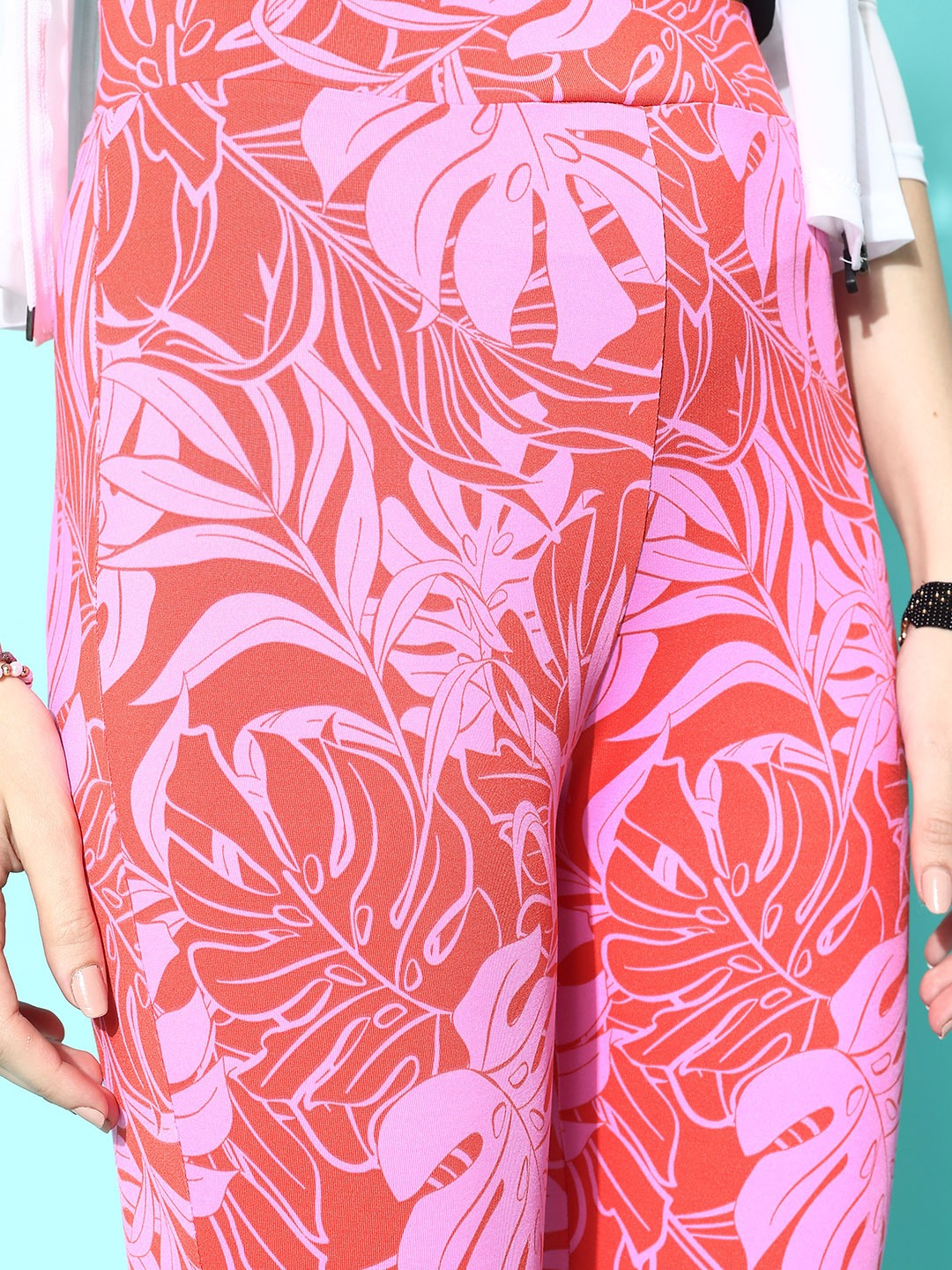 Berrylush Women Red & Pink Floral Printed Super Stretchy & High Waisted Sports Tights