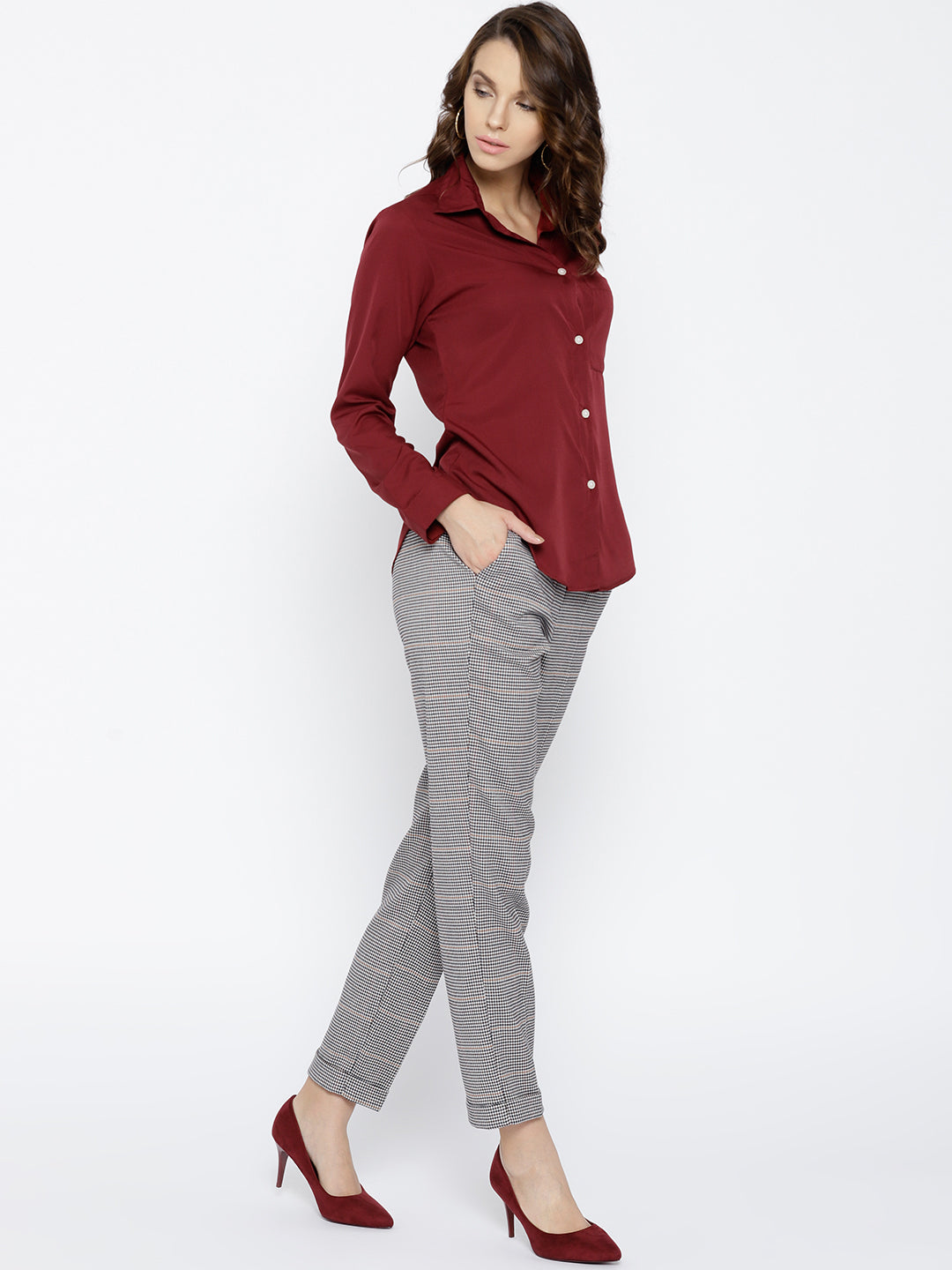 Inject a free-spirited and professional ascent to your capsule closet with this majestic Solid Maroon Spread Collar Neck Button Placket Curved Regular Shirt designed by Berrylush. The most admired element of this shirt is the amusing amalgam of maroon shade with the solid pattern which depicts your passionate personality with a classy appearance. The spread collar design of the shirt gives a formal highlight to your neckline with a refined sheen while the curved hemline presents a fascinating style. Complete the look by pairing this astonishing curved hem shirt with a pair of parallel trousers, hoop earrings, and strappy heels to create a mesmerizing look.