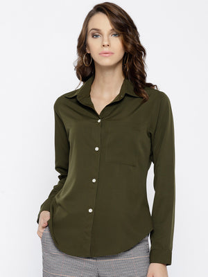 Berrylush Women Solid Olive Green Spread Collar Neck Button Placket Curved Regular Shirt