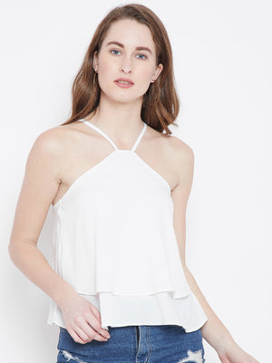 Berrylush Women Solid White Halter Neck Sleeveless Layered Regular Top