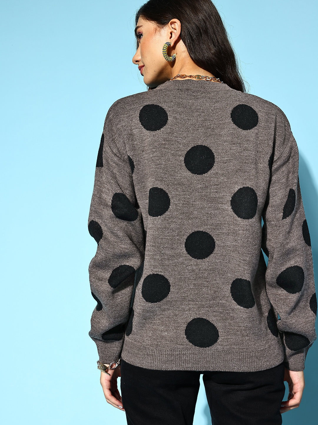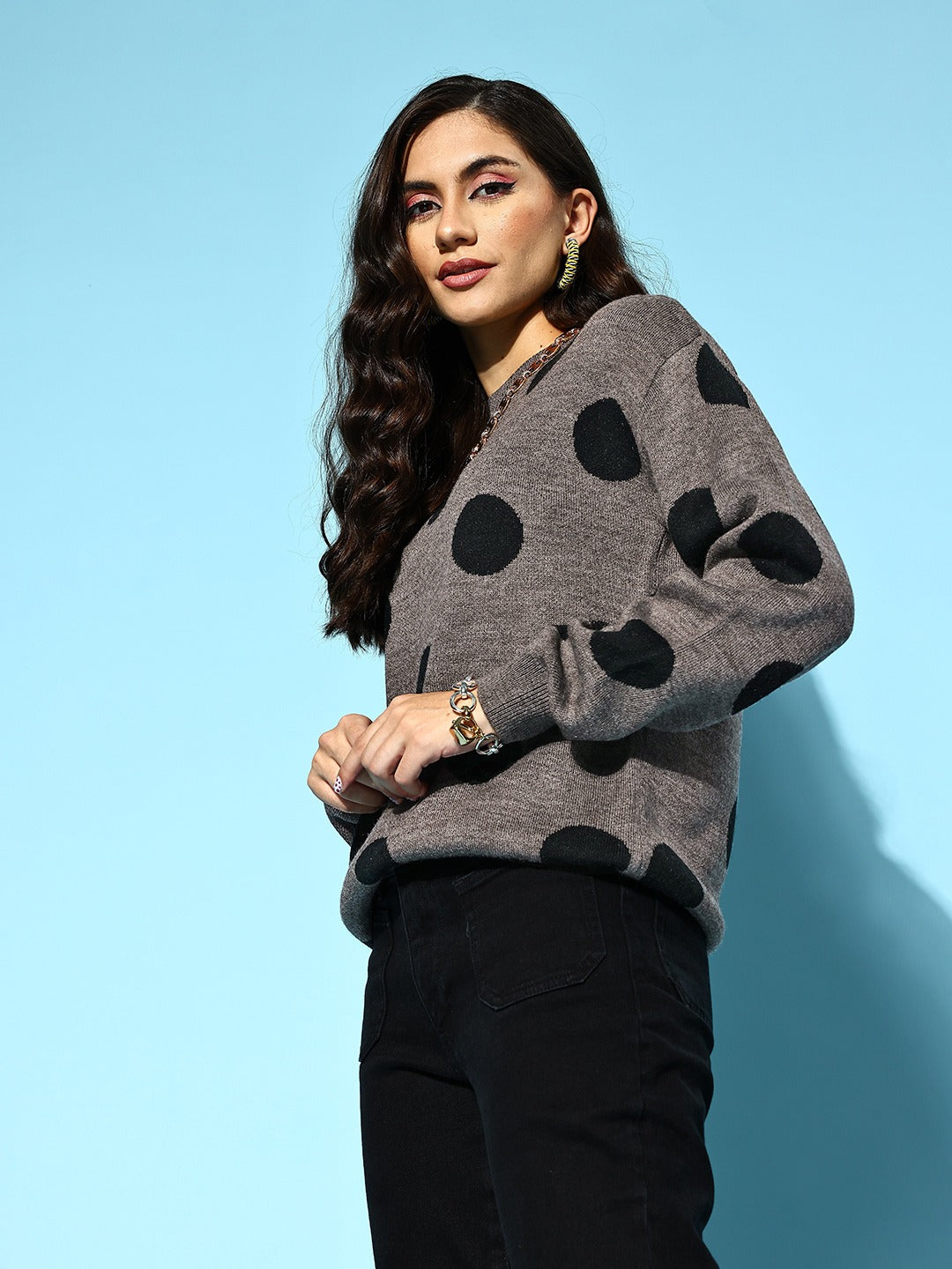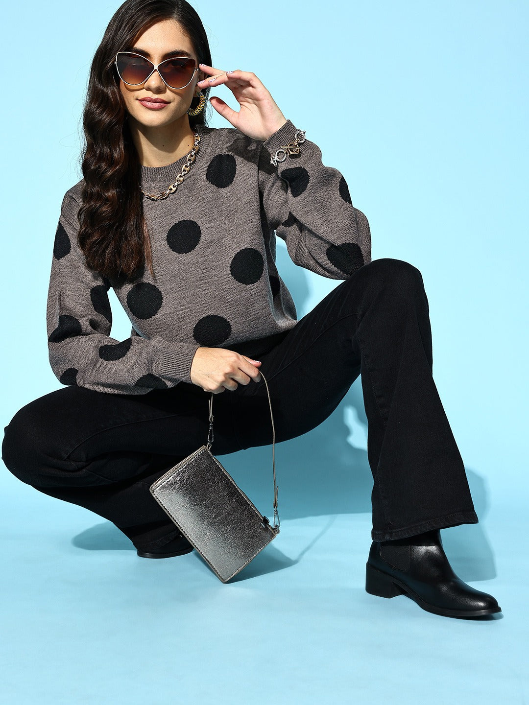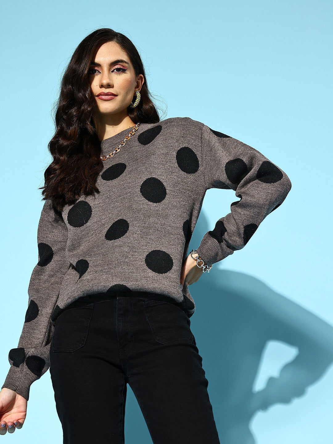 Berrylush Women Grey & Black Polka Dot Printed Round Neck Ribbed Hem Regular Pullover