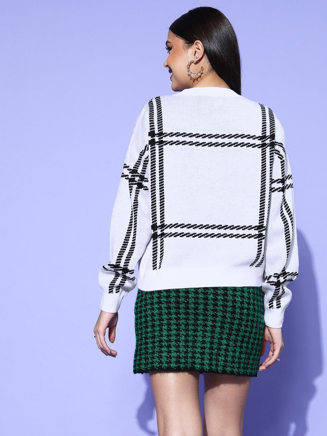 Berrylush Women White & Black Checked Print Round Neck Acrylic Ribbed Hem Regular Pullover