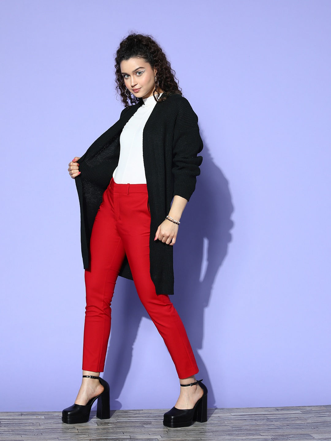 Berrylush Women Solid Black V-Neck Drop-Shoulder Sleeves Open-Front Acrylic Straight Hem Longline Sweater