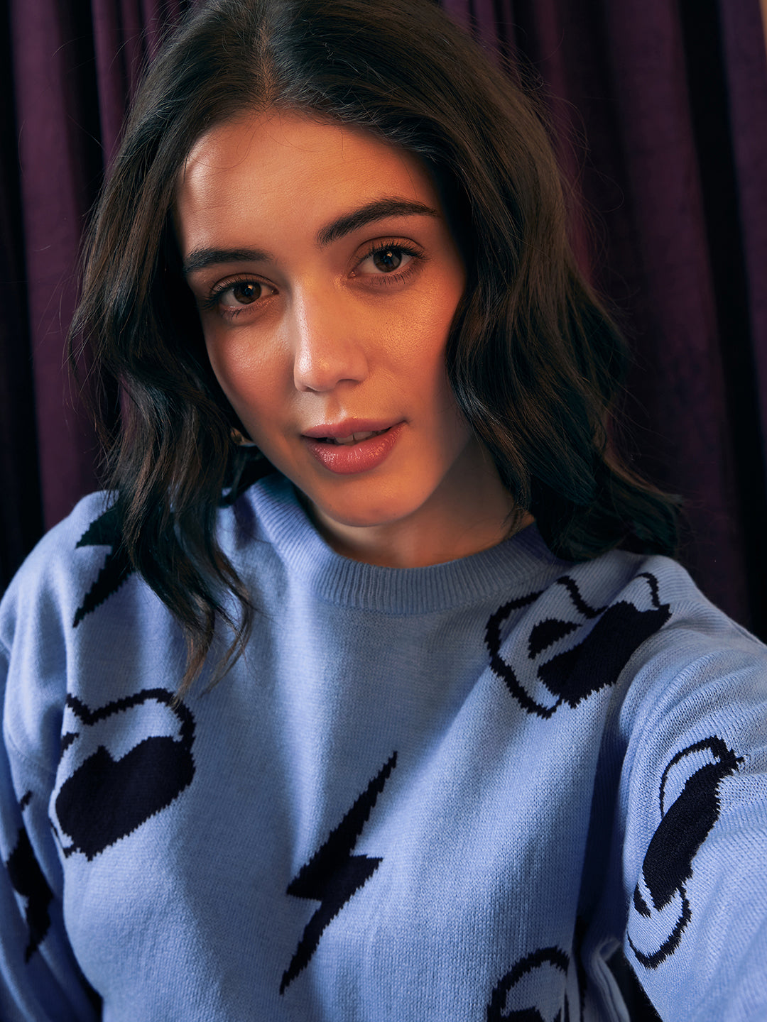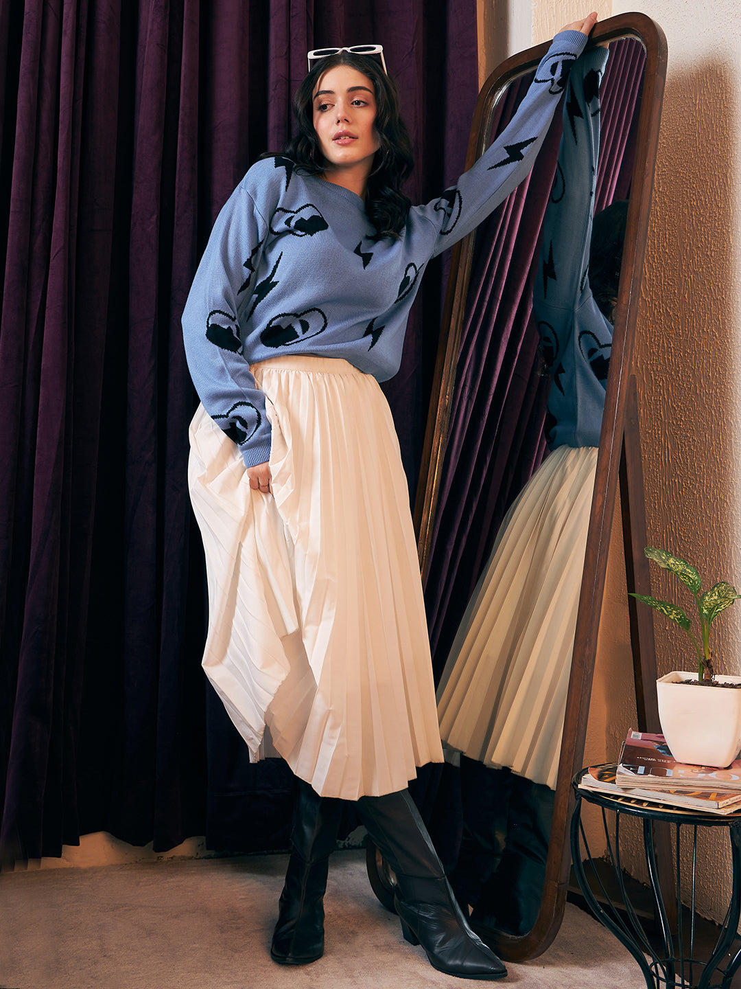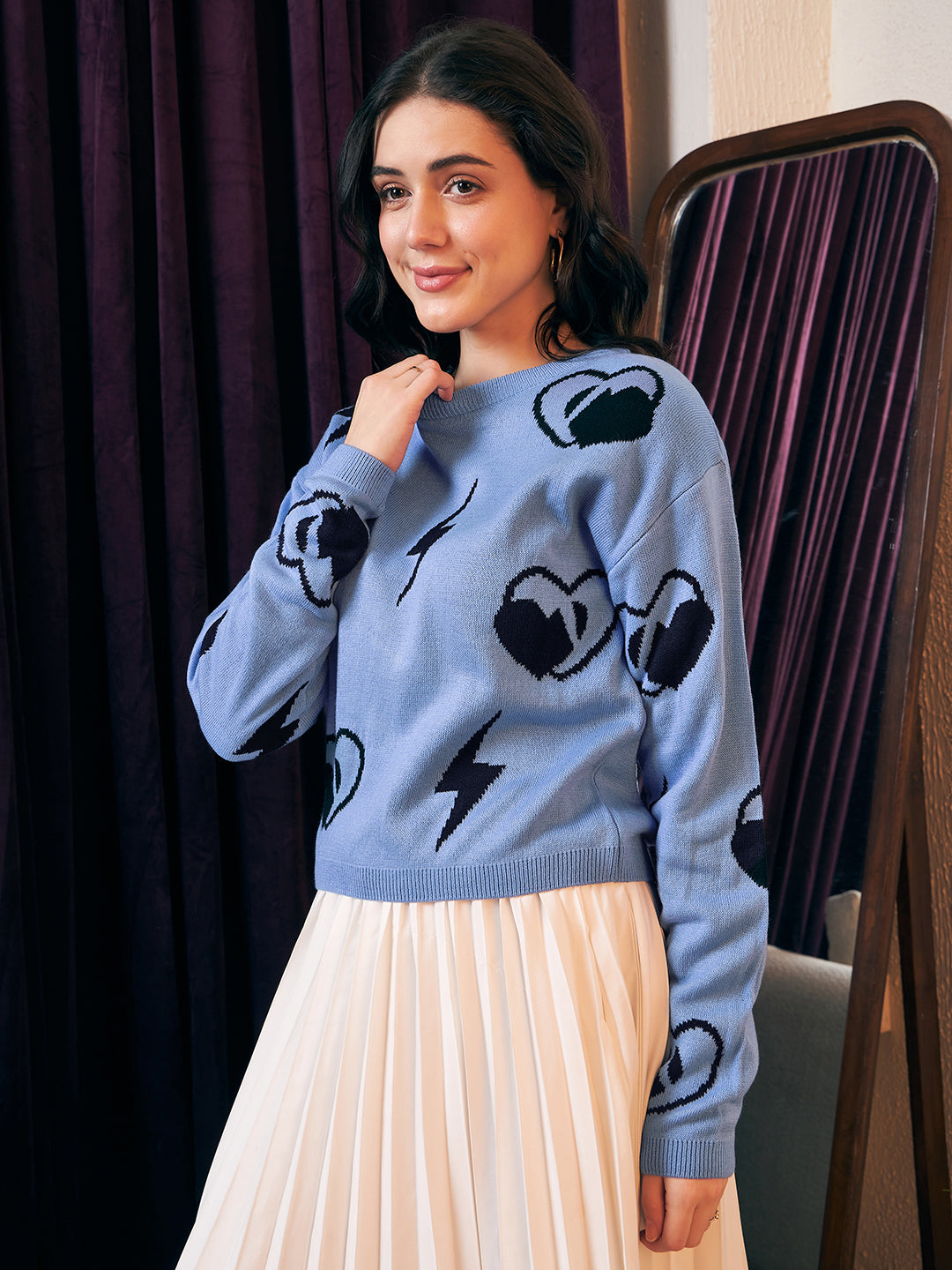 Berrylush Women Blue & Black Graphic Printed Round Neck Drop-Shoulder Sleeves Acrylic Ribbed Hem Knitted Regular Sweater