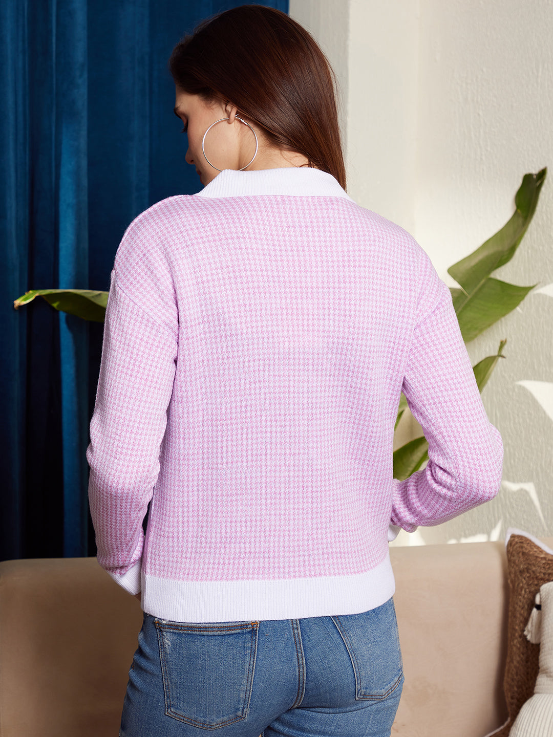 • The purple and white houndstooth print gives this sweater a chic and charismatic look