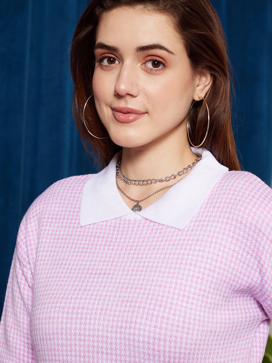 Elevate your casual wardrobe with the enchanting blend of purple and white in Berrylush's Purple & White Houndstooth Printed Contrast Collar Neck Ribbed Hem Regular Sweater. This statement piece combines timeless elegance with contemporary style, showcasing a bold houndstooth print that captures attention. Crafted from soft acrylic fabric, it offers unparalleled comfort without compromising on warmth. The drop-shoulder long sleeves add an element of relaxed sophistication, while the ribbed hem ensures a flattering fit for all body types. Featuring a classic collared neckline within its regular-length weave, this knitted sweater is opaque yet breathes life into your ensemble effortlessly - perfect for those seeking both fashion and function in their day-to-day attire.