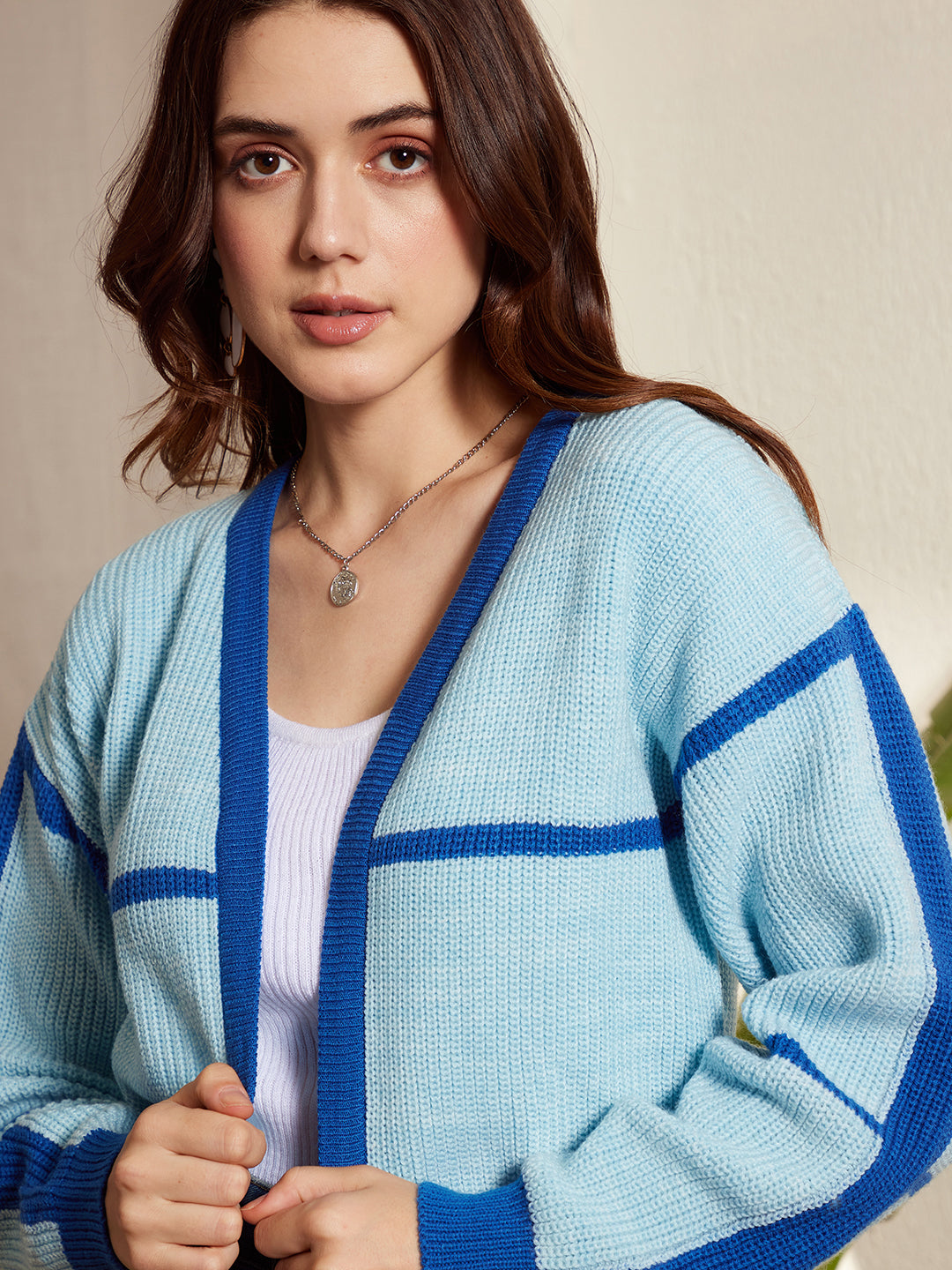 Berrylush Women Blue Striped Print Open-Front Neck Contrast Trim Ribbed Hem Regular Duster Cardigan