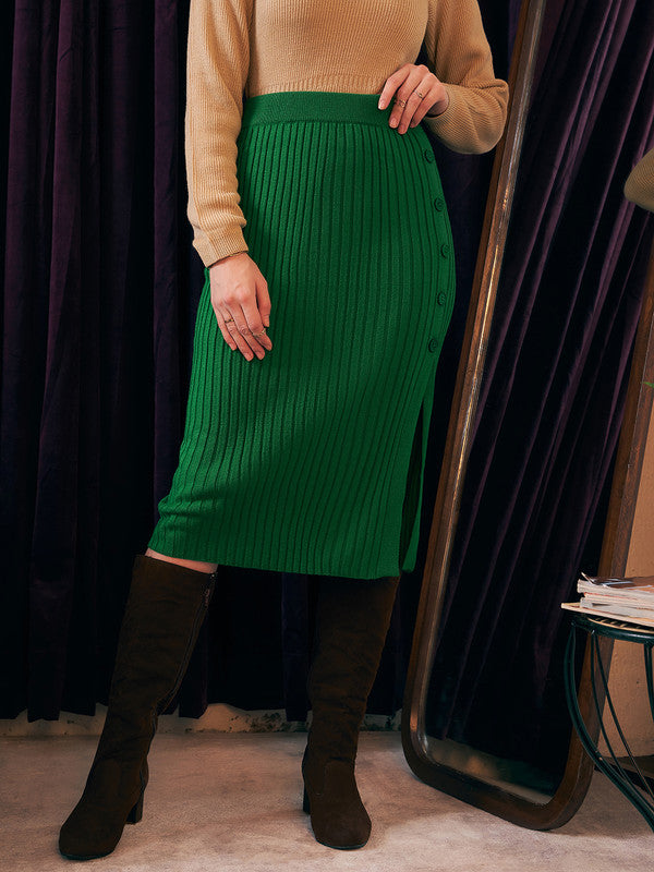 Introducing the Berrylush Solid Green Pencil Midi Skirt, where elegance meets contemporary style. Perfectly crafted with a high-rise waist and seamless slip-on closure enhanced by a chic button detail, this knitted garment showcases an exquisite ribbed texture for an added touch of sophistication. The skirt’s solid green hue complements its clean straight hemline while the daring side slit adds a flirtatious flair, making it ideal for both office wear and evening outings. Opaque and form-flattering, it promises comfort coupled with unmistakable allure—your new wardrobe staple waiting to shine!