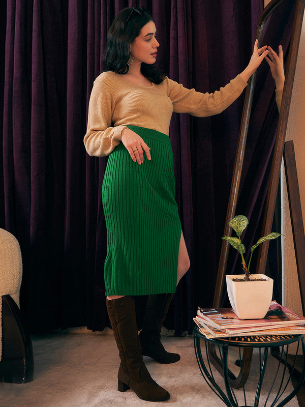 Berrylush Women Solid Green High-Rise Waist Slip-On Side-Slit Straight Hem Ribbed Pencil Midi Skirt