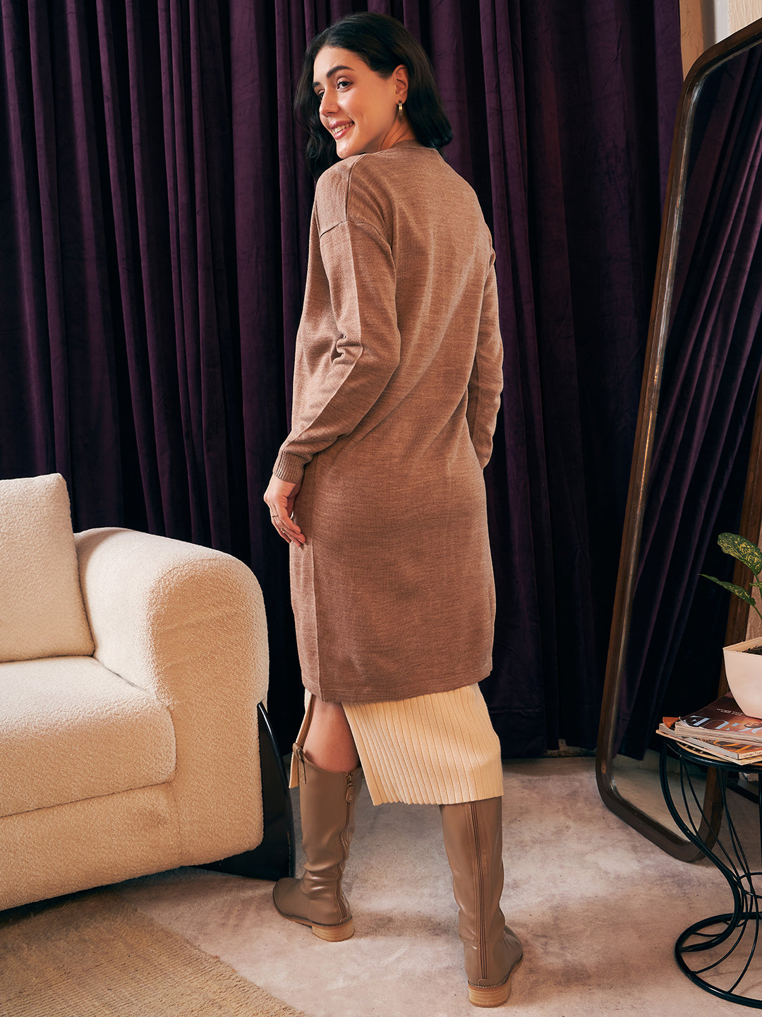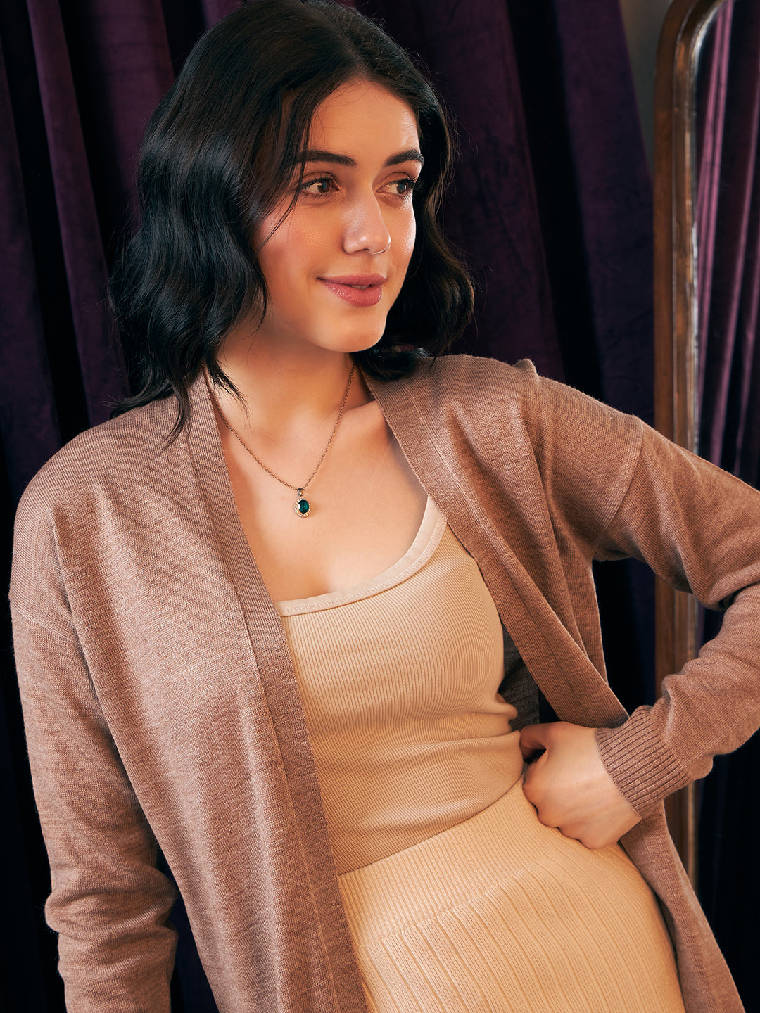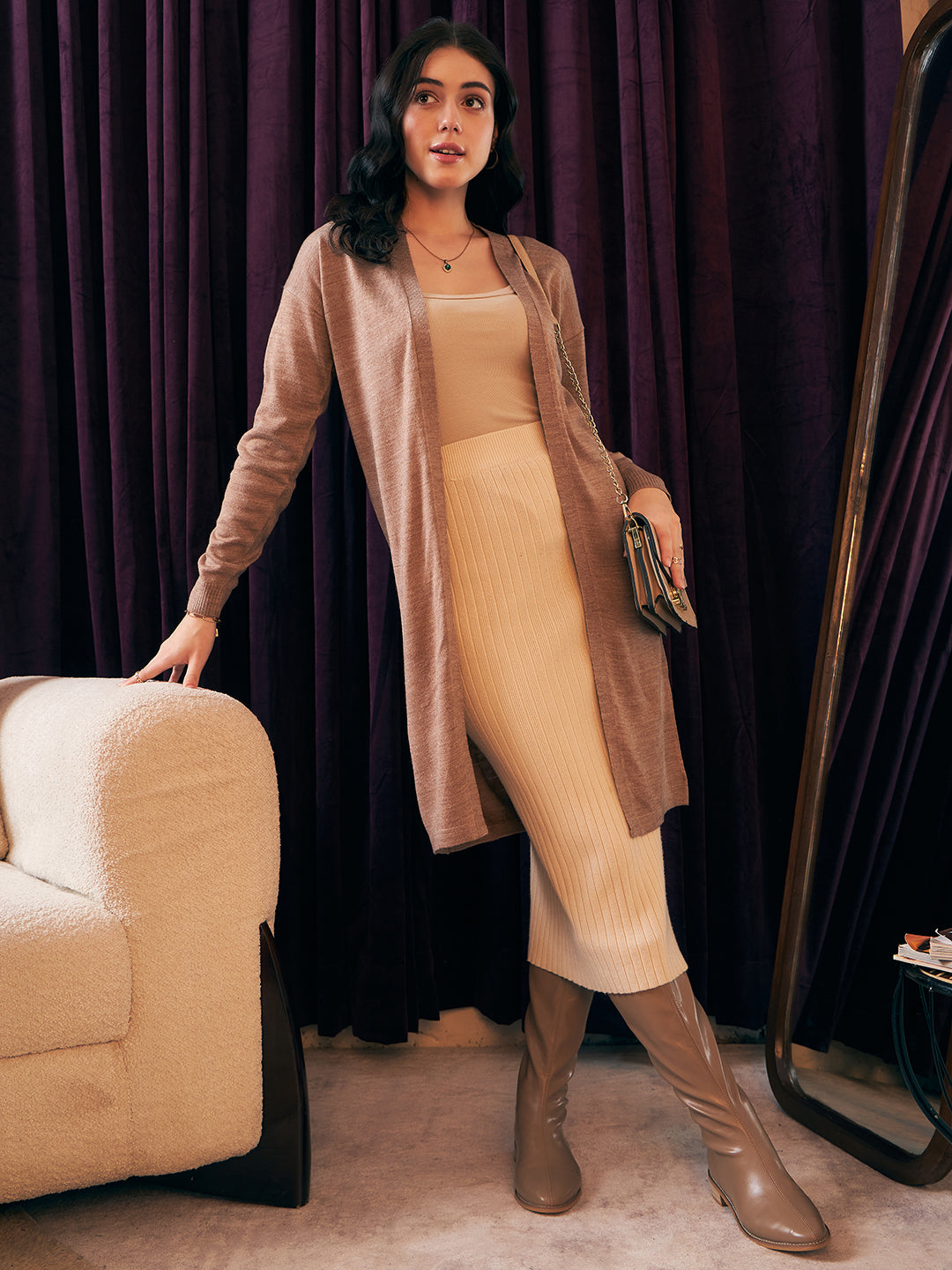Berrylush Women Solid Brown Open-Front Neck Acrylic Ribbed Hem Knitted Longline Cardigan