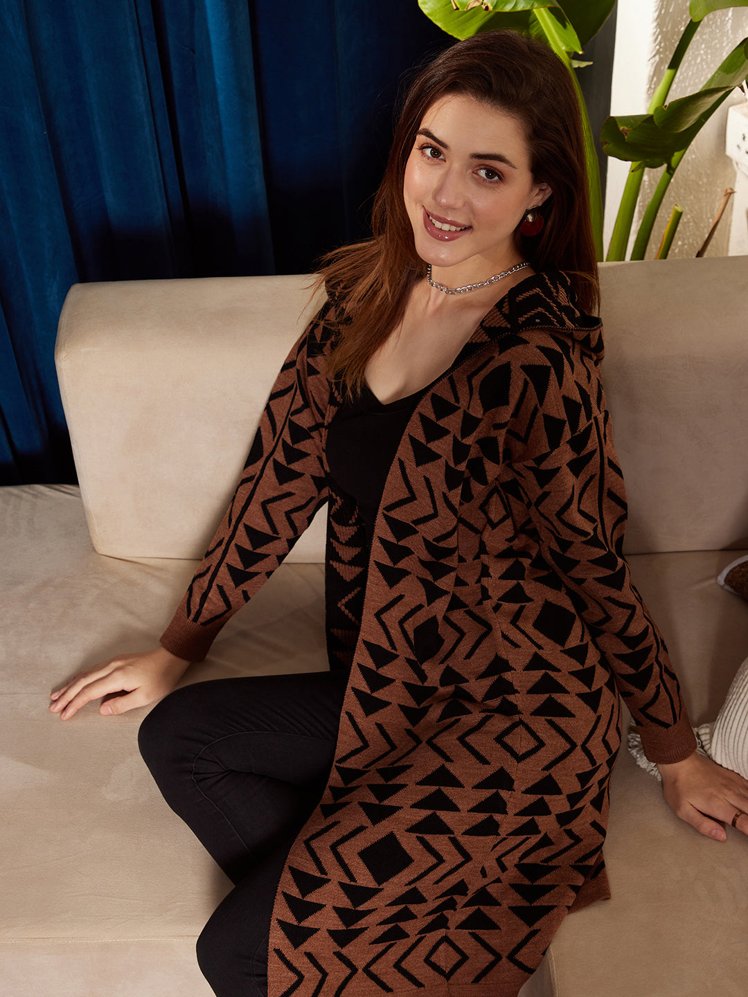 Berrylush Women Brown & Black Geometric Printed Hood Neck Drop-Shoulder Sleeves Open-Front Ribbed Hem Longline Cardigan