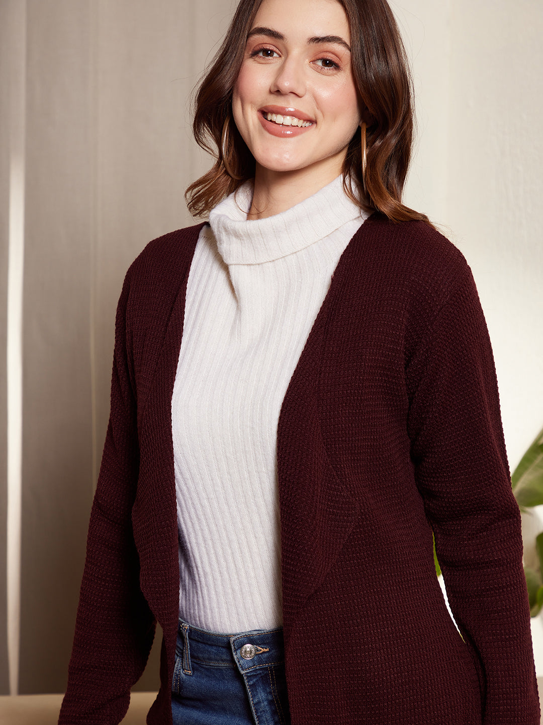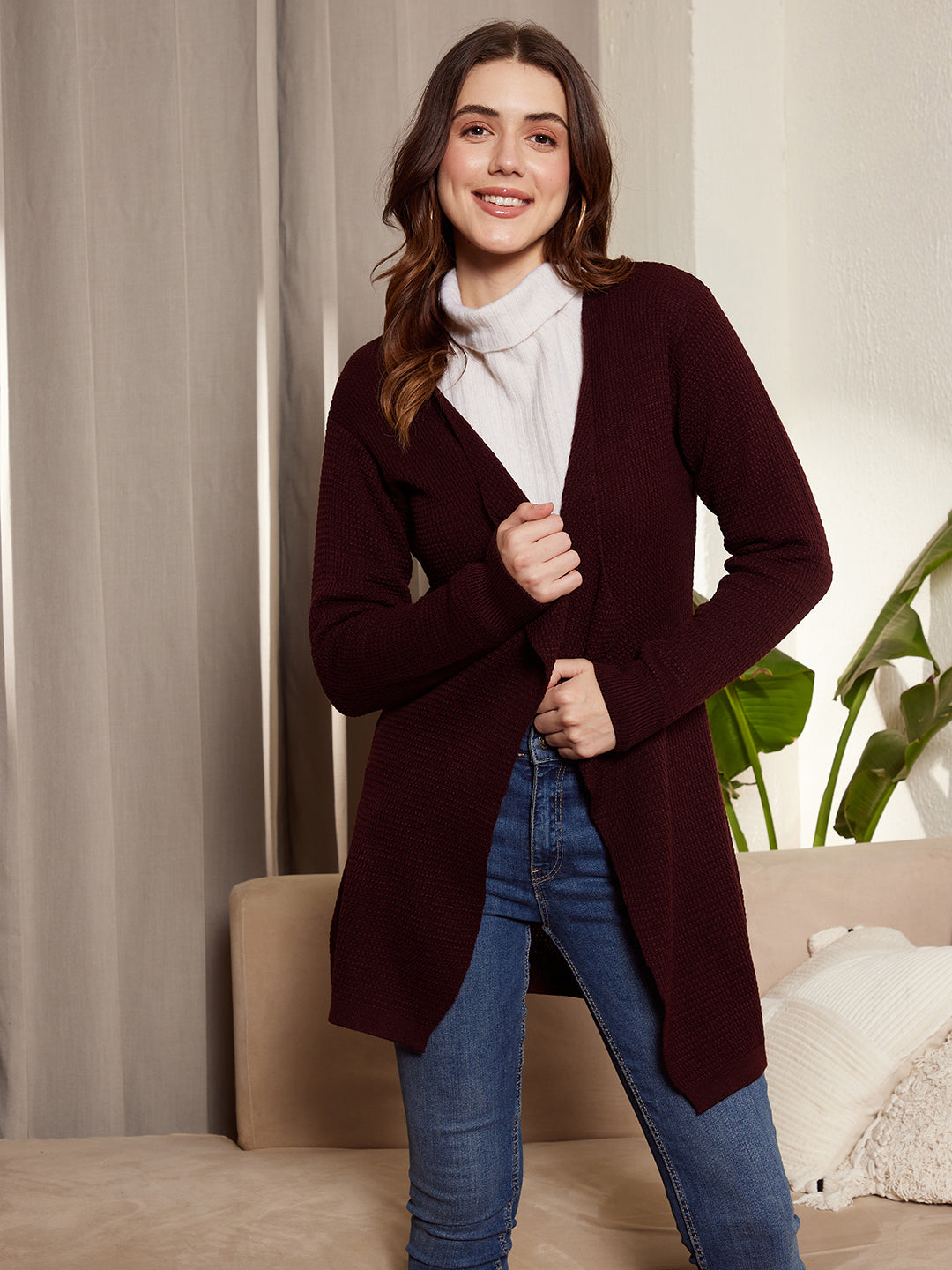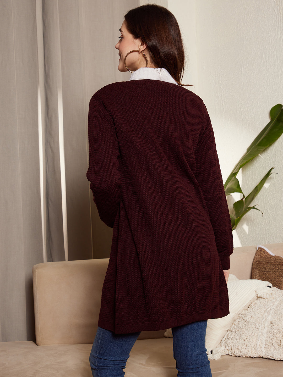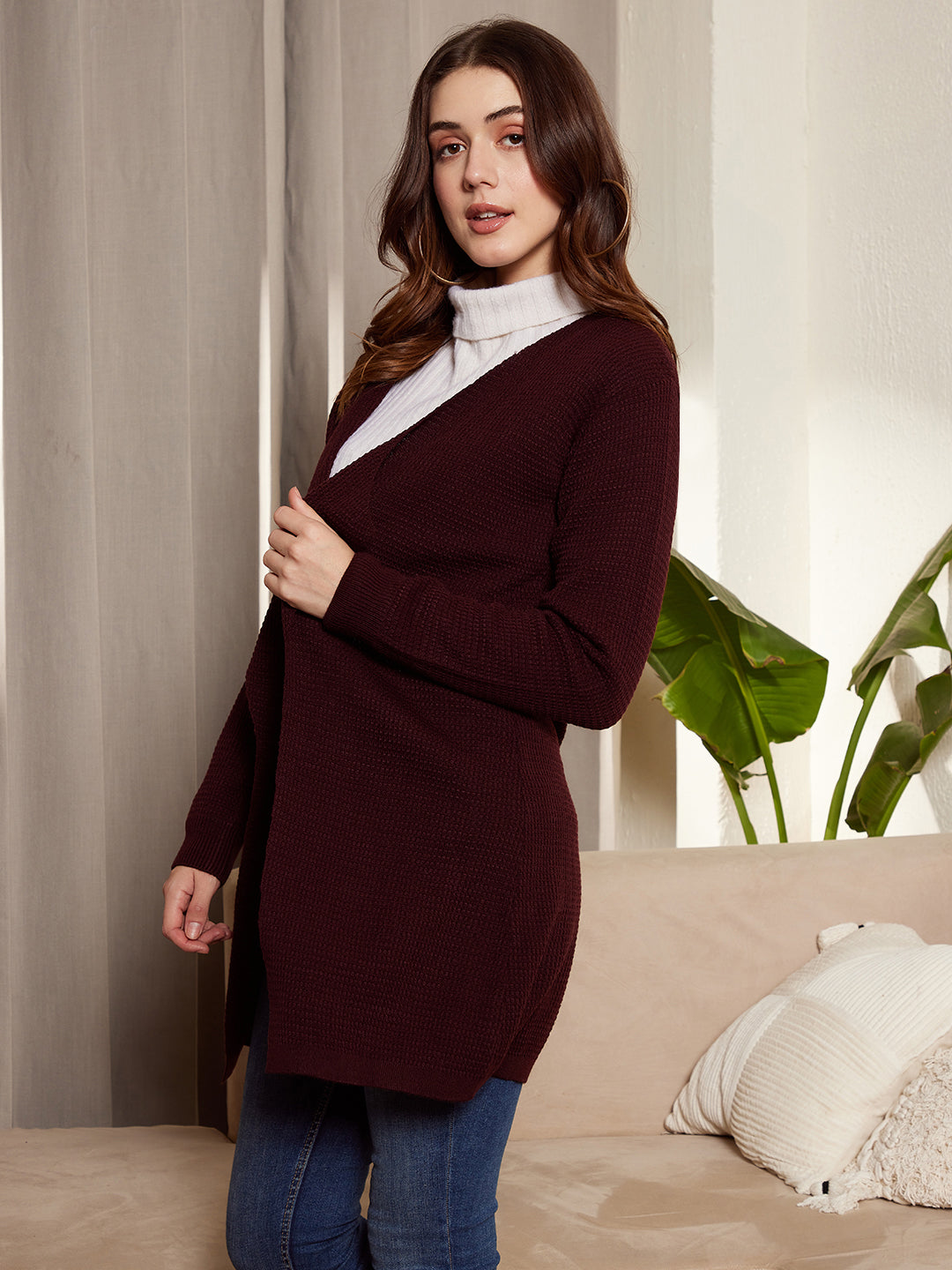 Berrylush Women Solid Maroon Open-Front Acrylic Straight Hem Knitted Longline Cardigan