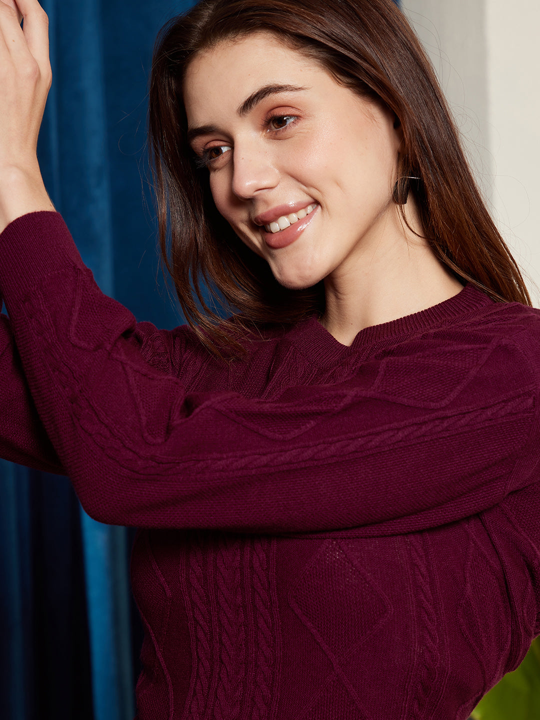 Berrylush Women Solid Burgundy Round Neck Acrylic Back Tie-Up Ribbed Hem Cable Knitted Crop Sweater