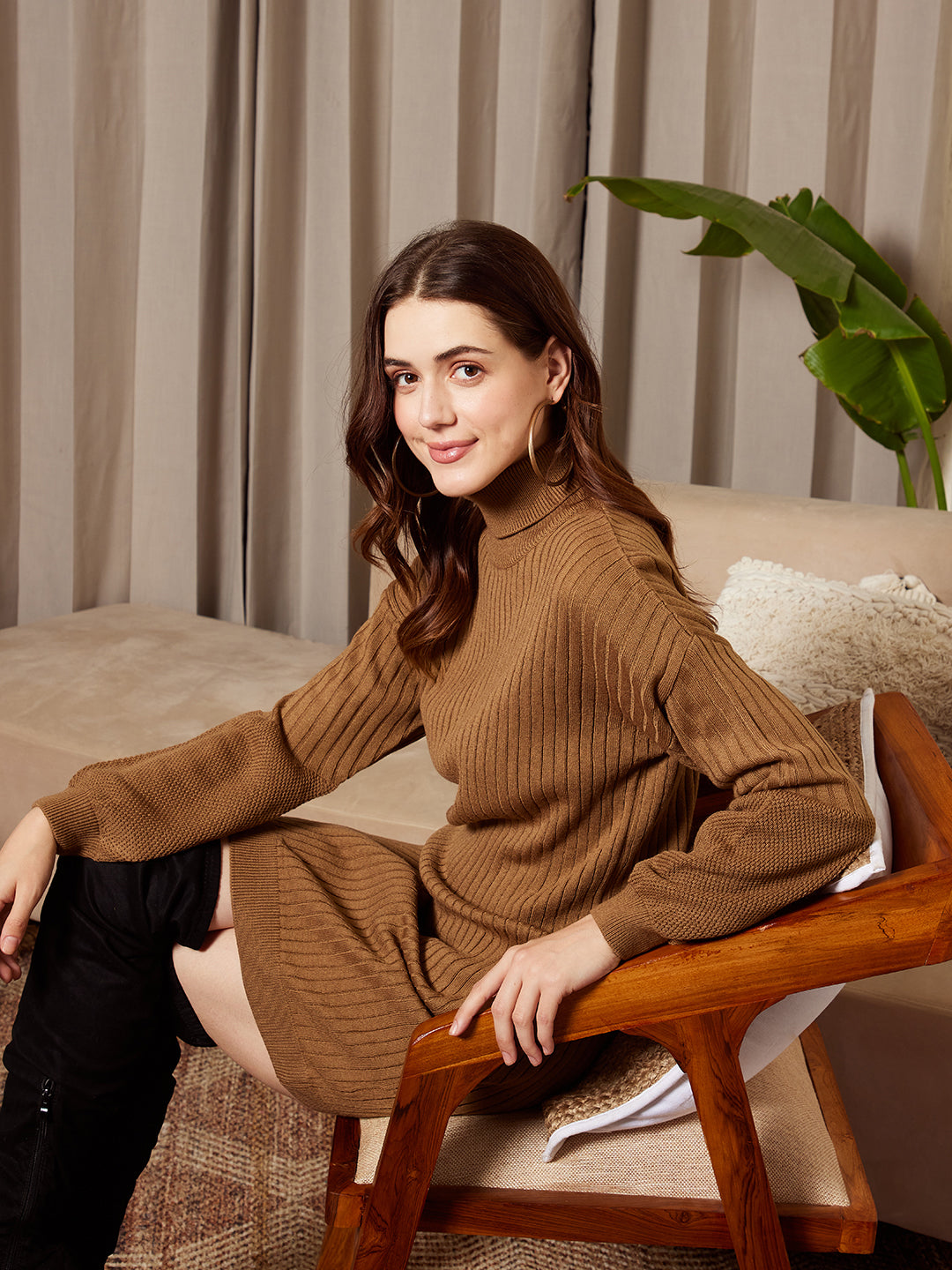 Introducing the Berrylush Solid Brown Turtle Neck Bodycon Sweater Dress, your new go-to piece for effortlessly chic casual looks. Crafted from cosy acrylic fabric with a snug knitted weave, this mini-length dress promises both style and warmth. The sophisticated brown hue complements its solid pattern, creating an elegant canvas that accentuates your silhouette. Featuring trendy drop-shoulder long sleeves and a classic turtle neckline, it offers comfort without compromising on style. Its body-hugging fit is perfectly balanced by the straight hemline, ensuring a flattering figure for any occasion. Embrace opaqueness with confidence in this captivating ensemble—a timeless addition to your wardrobe essentials.